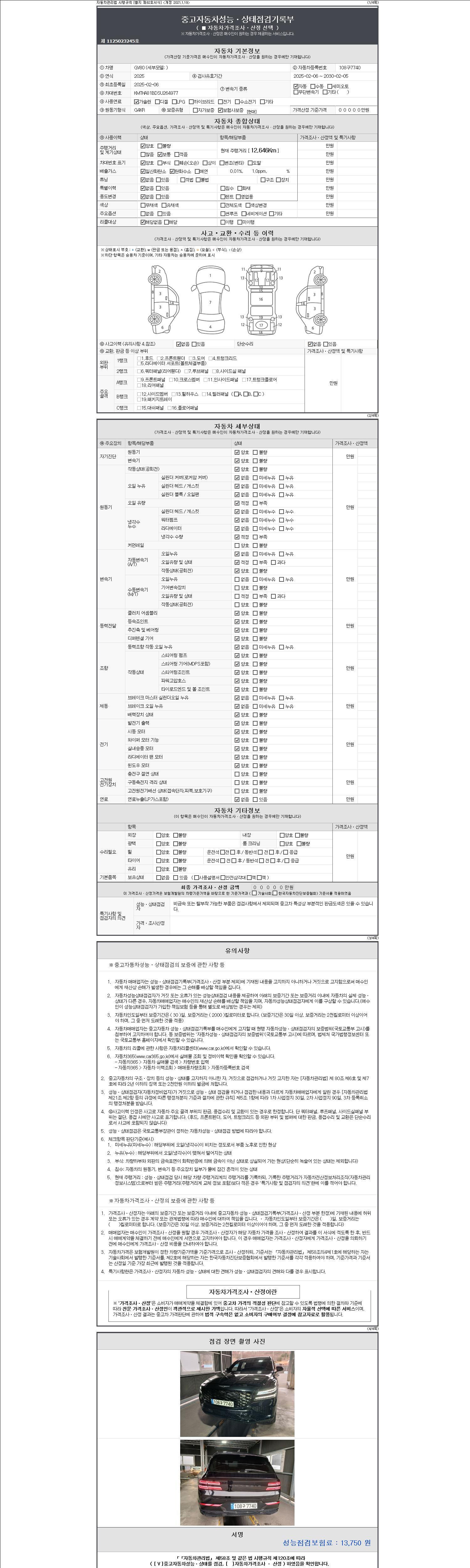 | 주행거리 | 12,646 km | 차량번호 | 108구7740 | 사고유무 | 성능기록부 참조 | 제시번호 | 제 2147483647 호 |