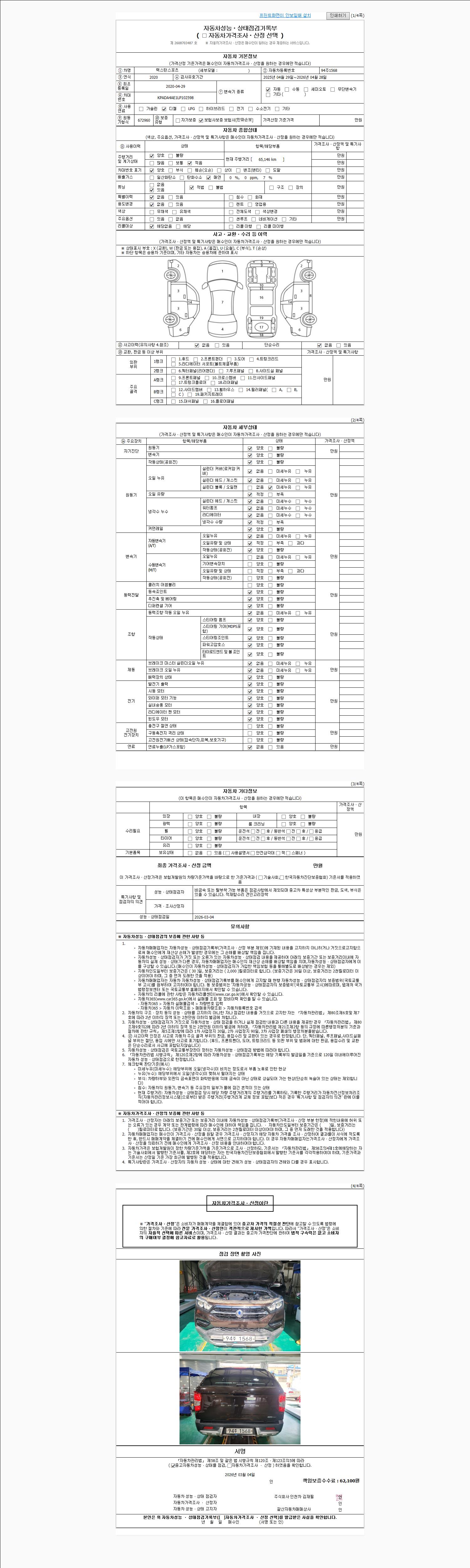 | 주행거리 | 65,146 km | 차량번호 | 94주1568 | 사고유무 | 성능기록부 참조 | 제시번호 | 제 2026010978 호 |