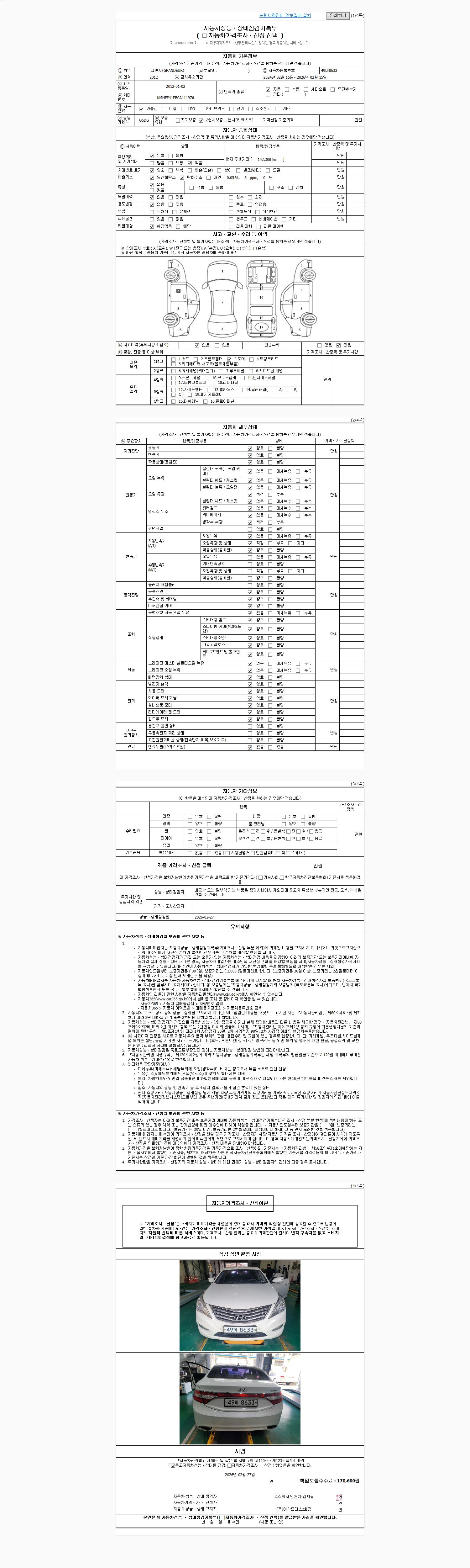 | 주행거리 | 142,308 km | 차량번호 | 49머8633 | 사고유무 | 성능기록부 참조 | 제시번호 | 제 2026010327 호 |