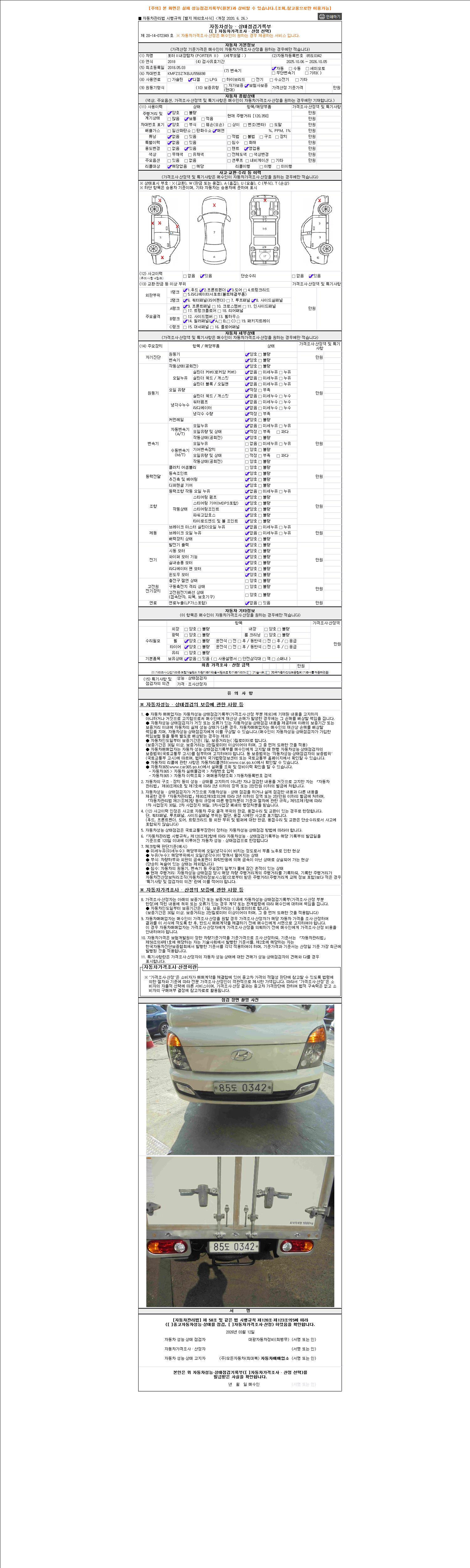| 주행거리 | 120,325 km | 차량번호 | 85도0342 | 사고유무 | 성능기록부 참조 | 제시번호 | 제 2026027692 호 |