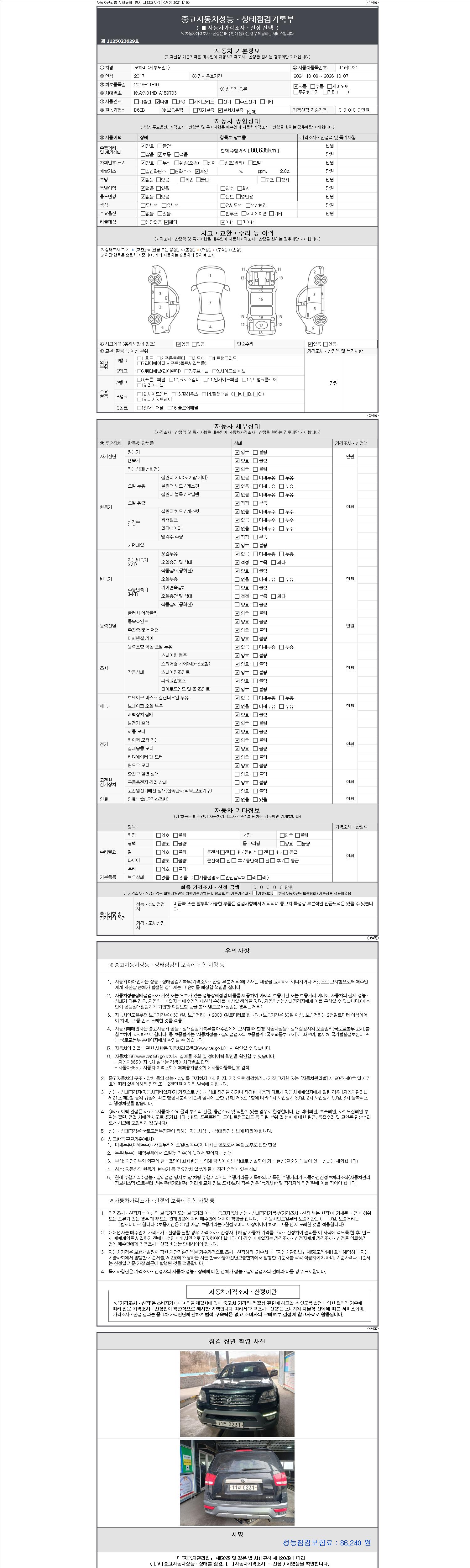 | 주행거리 | 80,635 km | 차량번호 | 11러0231 | 사고유무 | 성능기록부 참조 | 제시번호 | 제 2147483647 호 |