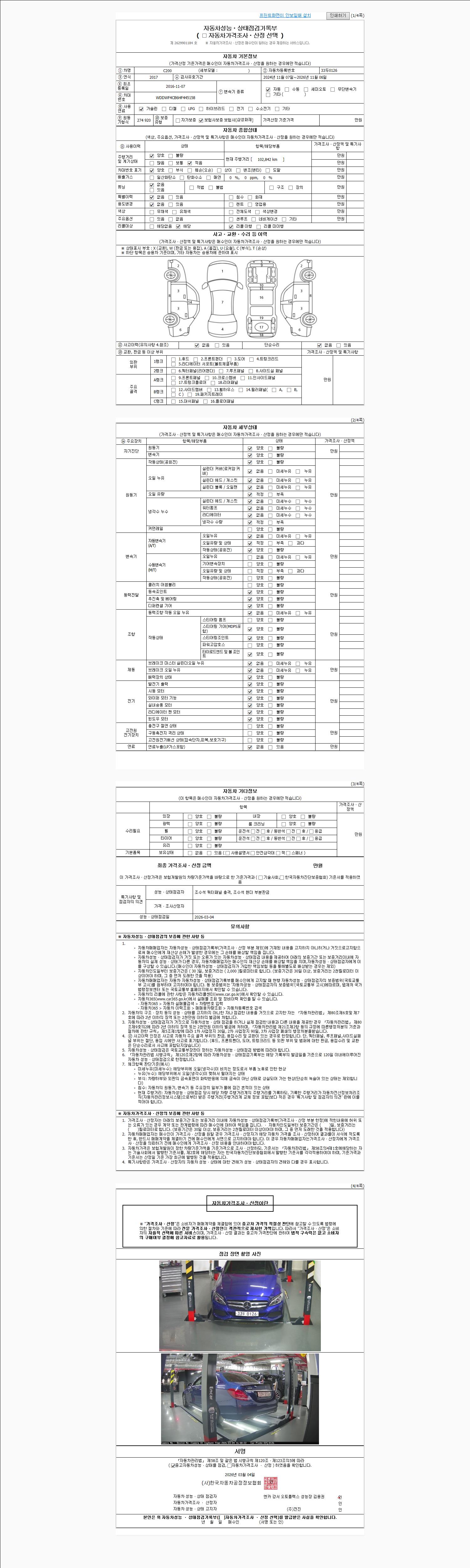 자동차관리법 시행규칙 제120조의 규정에 따라 별지 제 82호서식 《중고자동차 성능, 상태점검 기록부》를 발행한 성능, 상태점검자 및 매매자는 아래의 보증기간 또는 보증거리 이내의 중고자동차, 성능점검 기록부에 기재된 내용과 자동차의 실제 성능, 상태가 다른 경우 계약 또는 관계법령에 따라 매수인에 대하여 책임을 집니다.