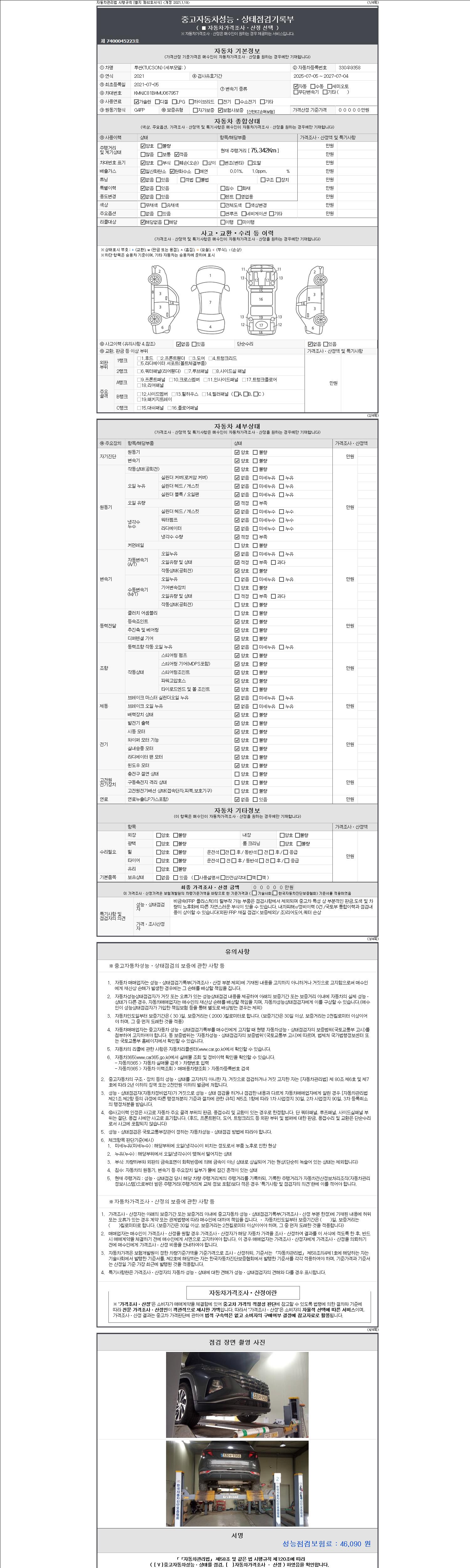 자동차관리법 시행규칙 제120조의 규정에 따라 별지 제 82호서식 《중고자동차 성능, 상태점검 기록부》를 발행한 성능, 상태점검자 및 매매자는 아래의 보증기간 또는 보증거리 이내의 중고자동차, 성능점검 기록부에 기재된 내용과 자동차의 실제 성능, 상태가 다른 경우 계약 또는 관계법령에 따라 매수인에 대하여 책임을 집니다.