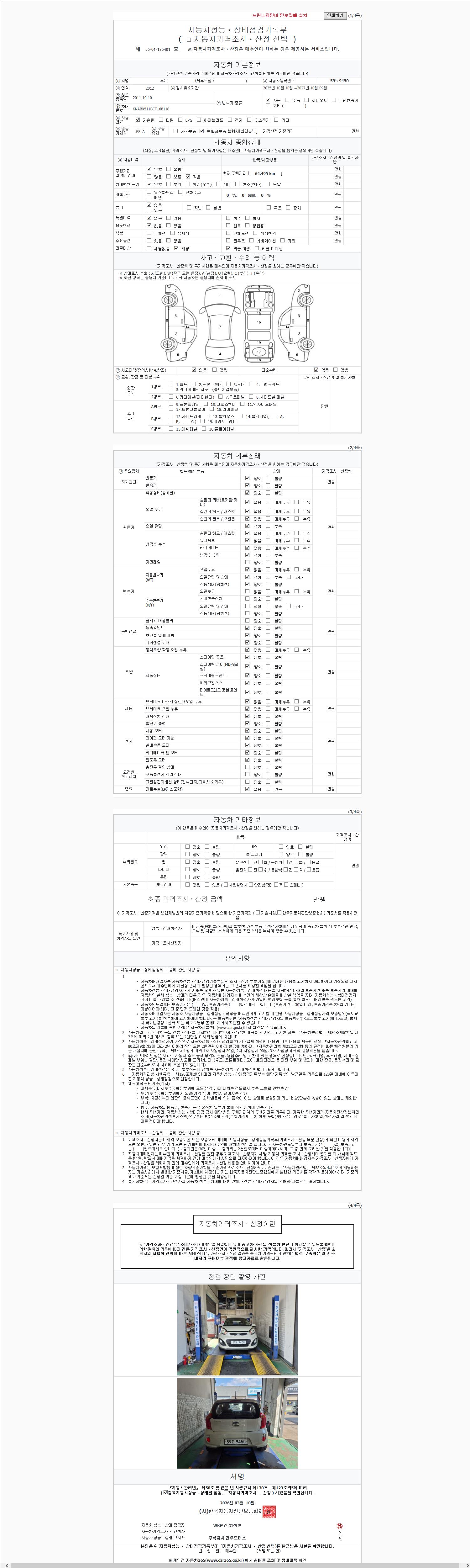 | 주행거리 | 64,495 km | 차량번호 | 59도9450 | 사고유무 | 성능기록부 참조 | 제시번호 | 제 2147483647 호 |