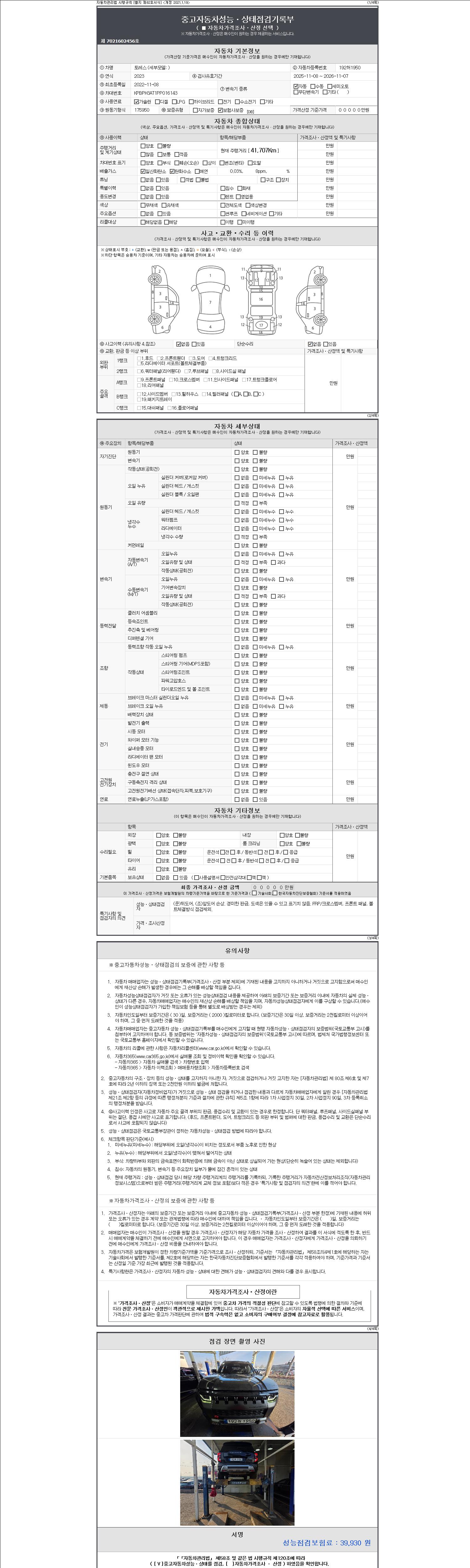 자동차관리법 시행규칙 제120조의 규정에 따라 별지 제 82호서식 《중고자동차 성능, 상태점검 기록부》를 발행한 성능, 상태점검자 및 매매자는 아래의 보증기간 또는 보증거리 이내의 중고자동차, 성능점검 기록부에 기재된 내용과 자동차의 실제 성능, 상태가 다른 경우 계약 또는 관계법령에 따라 매수인에 대하여 책임을 집니다.