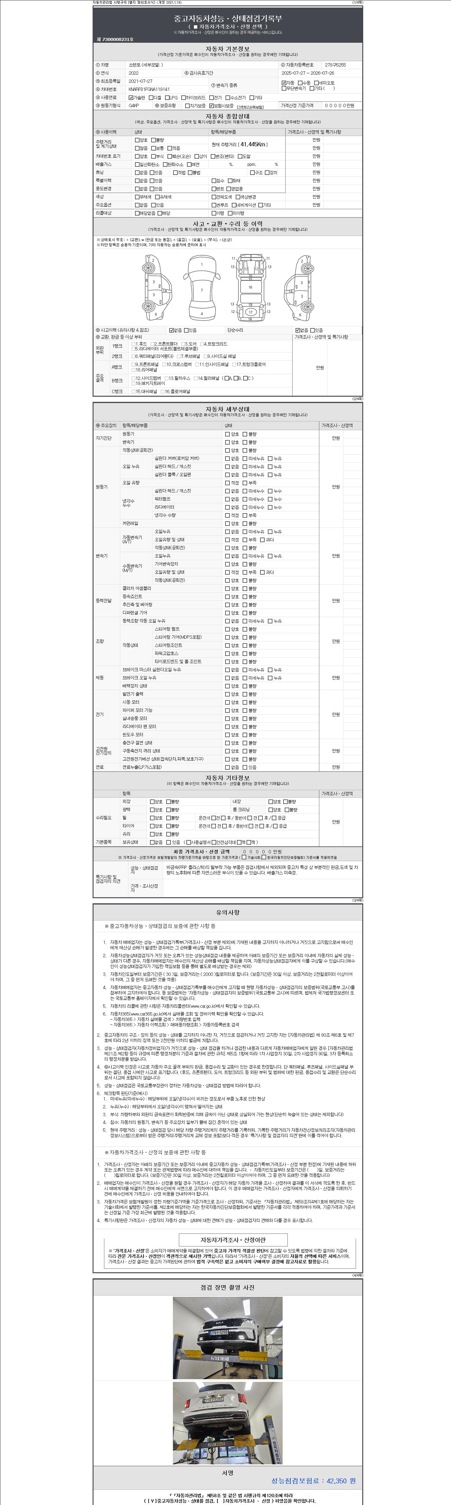 자동차관리법 시행규칙 제120조의 규정에 따라 별지 제 82호서식 《중고자동차 성능, 상태점검 기록부》를 발행한 성능, 상태점검자 및 매매자는 아래의 보증기간 또는 보증거리 이내의 중고자동차, 성능점검 기록부에 기재된 내용과 자동차의 실제 성능, 상태가 다른 경우 계약 또는 관계법령에 따라 매수인에 대하여 책임을 집니다.