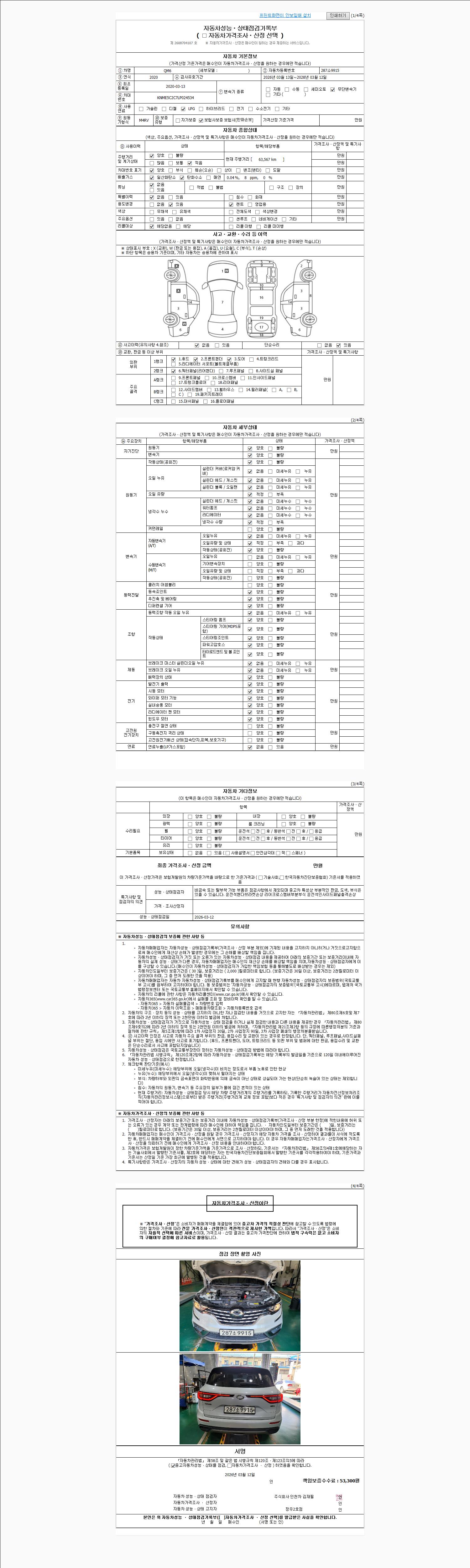 | 주행거리 | 63,567 km | 차량번호 | 287소9915 | 사고유무 | 성능기록부 참조 | 제시번호 | 제 2026012530 호 |