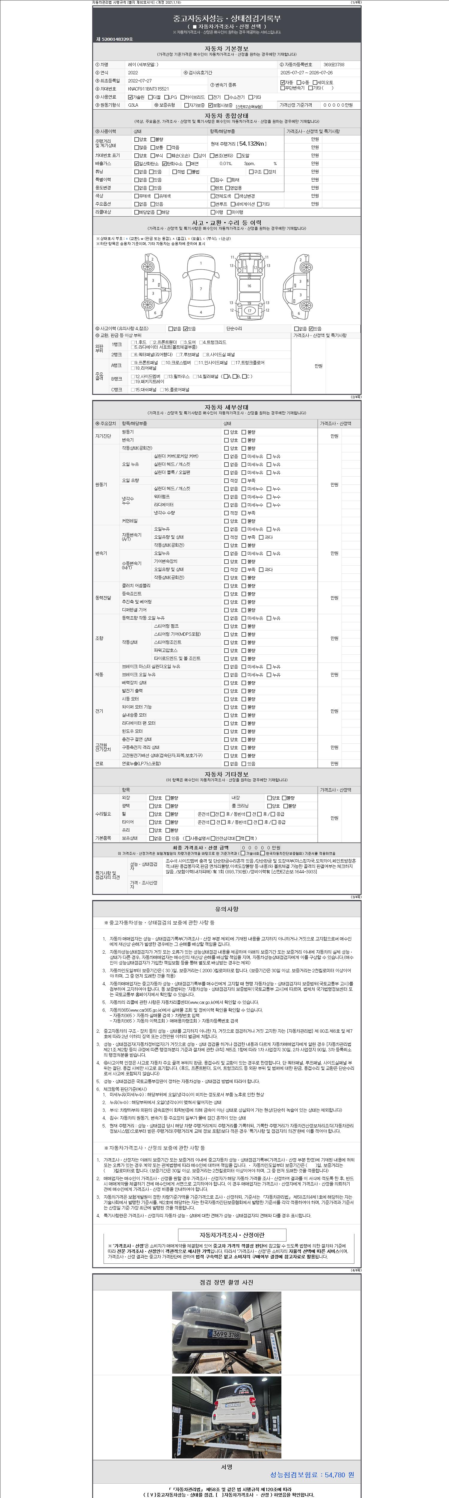 | 주행거리 | 54,129 km | 차량번호 | 369모3788 | 사고유무 | 성능기록부 참조 | 제시번호 | 제 2147483647 호 |