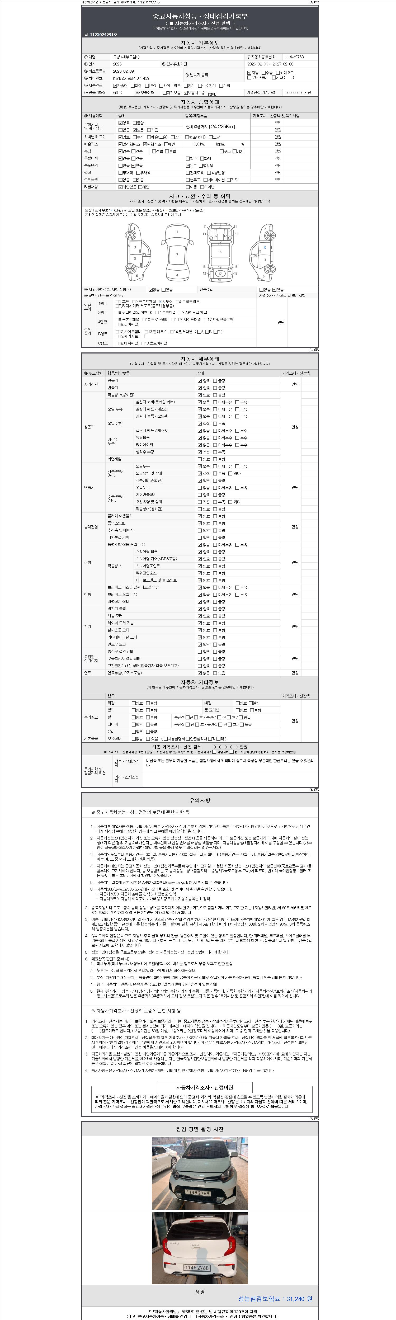 | 주행거리 | 24,226 km | 차량번호 | 114서2768 | 사고유무 | 성능기록부 참조 | 제시번호 | 제 2147483647 호 |
