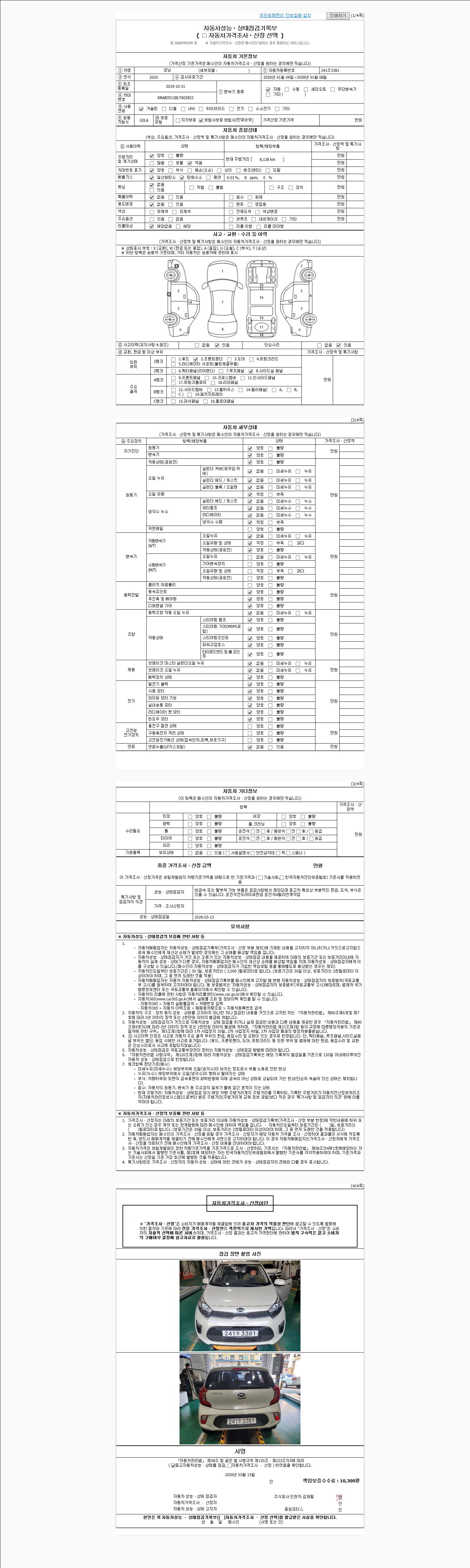| 주행거리 | 8,138 km | 차량번호 | 241주3381 | 사고유무 | 성능기록부 참조 | 제시번호 | 제 2026013157 호 |