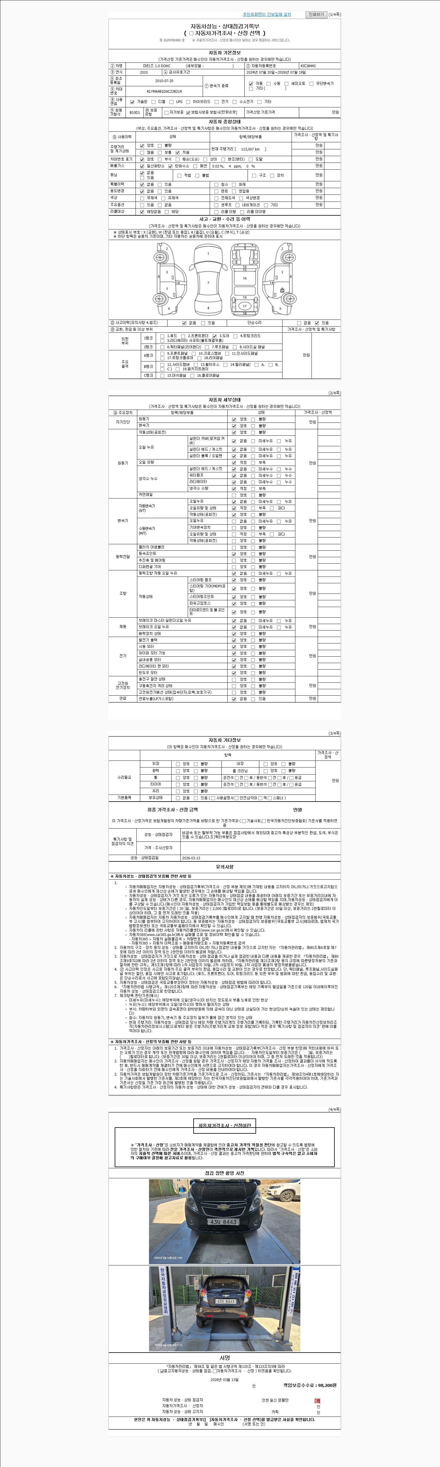 | 주행거리 | 113,005 km | 차량번호 | 43다8443 | 사고유무 | 성능기록부 참조 | 제시번호 | 제 2026013186 호 |