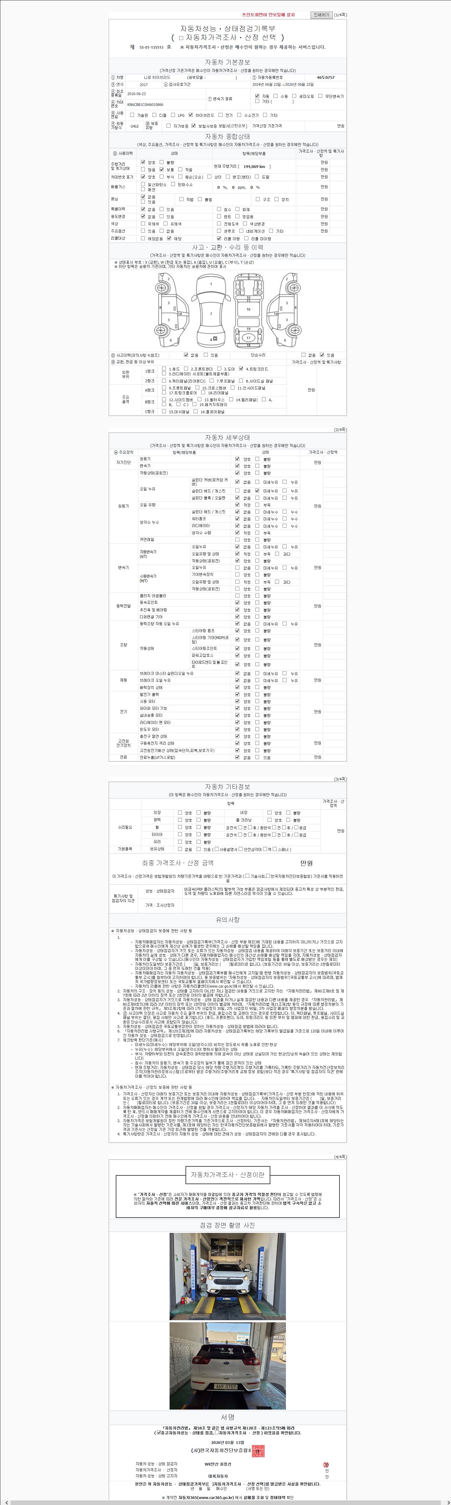 -중고자동차 매매업자를 통해 차량을 구입하실 경우 반드시 "중고자동차 성능, 상태점검 기록부"를 교뷰 받으셔야 하며, 매매업자는 반드시 의무 교부 하여야 압니다.
