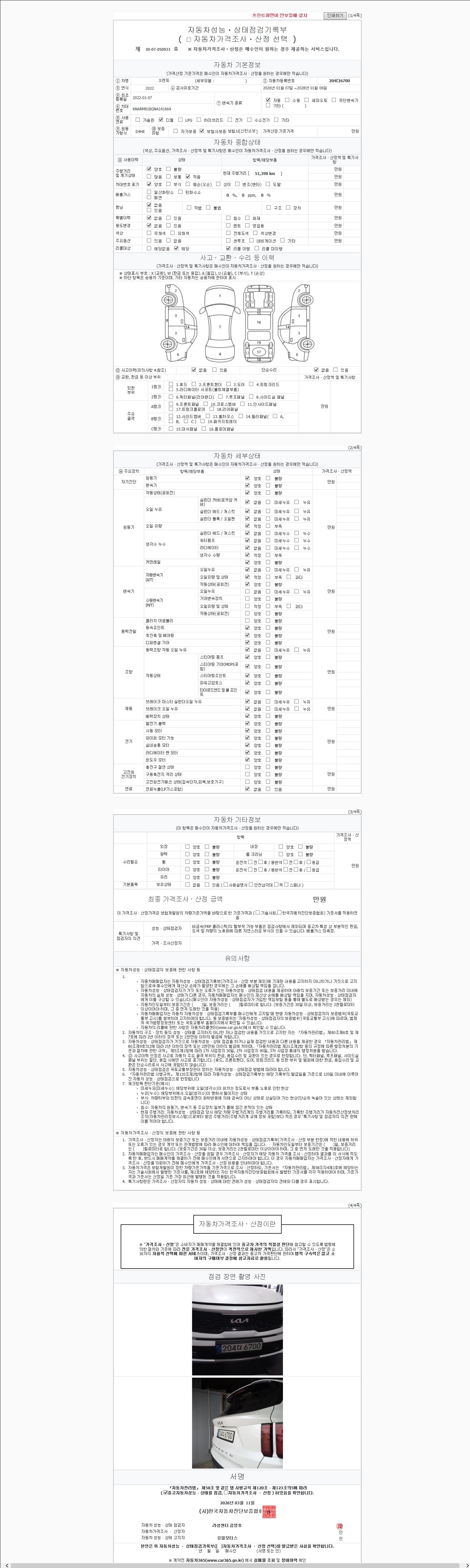 | 주행거리 | 51,398 km | 차량번호 | 204다6700 | 사고유무 | 성능기록부 참조 | 제시번호 | 제 2147483647 호 |