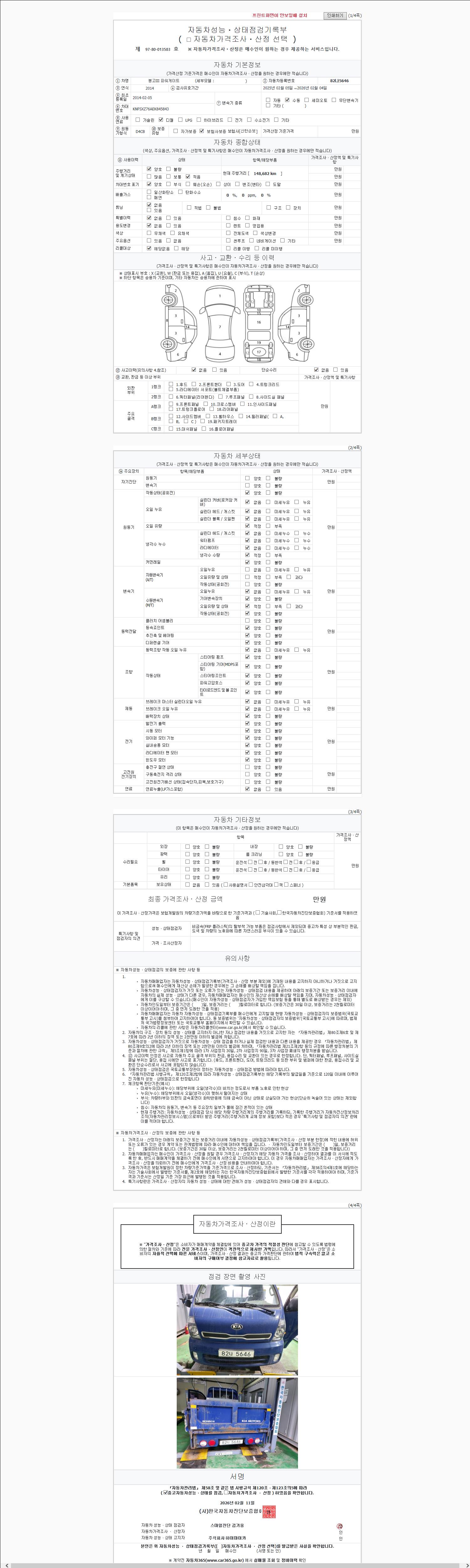 | 주행거리 | 148,682 km | 차량번호 | 82나5646 | 사고유무 | 성능기록부 참조 | 제시번호 | 제 2026019125 호 |
