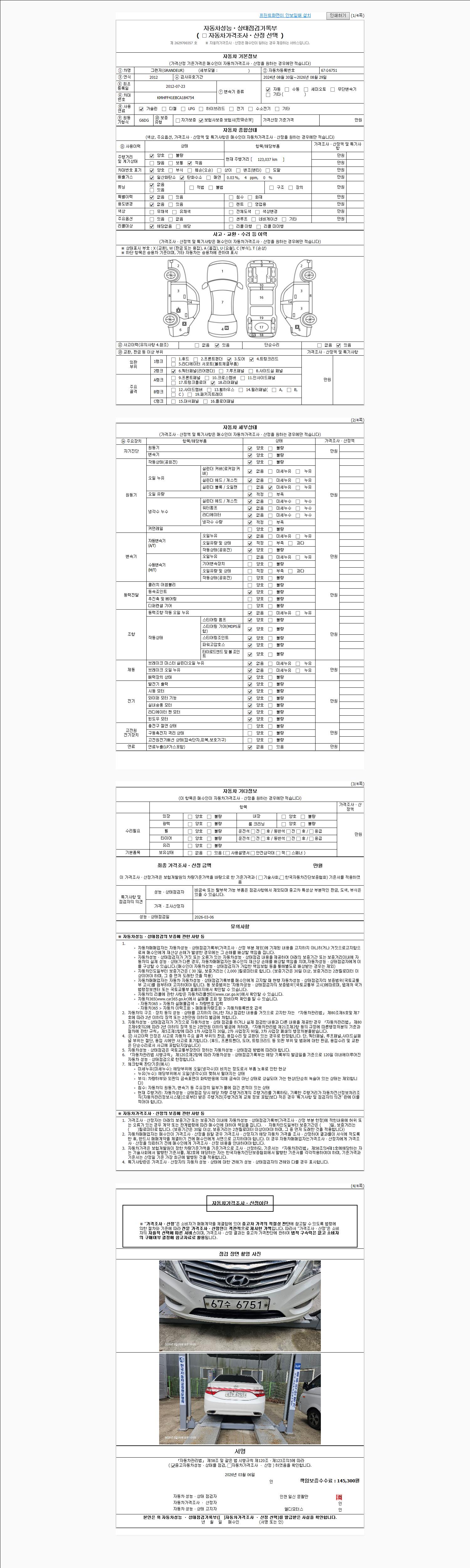 | 주행거리 | 123,037 km | 차량번호 | 67수6751 | 사고유무 | 성능기록부 참조 | 제시번호 | 제 2026008050 호 |