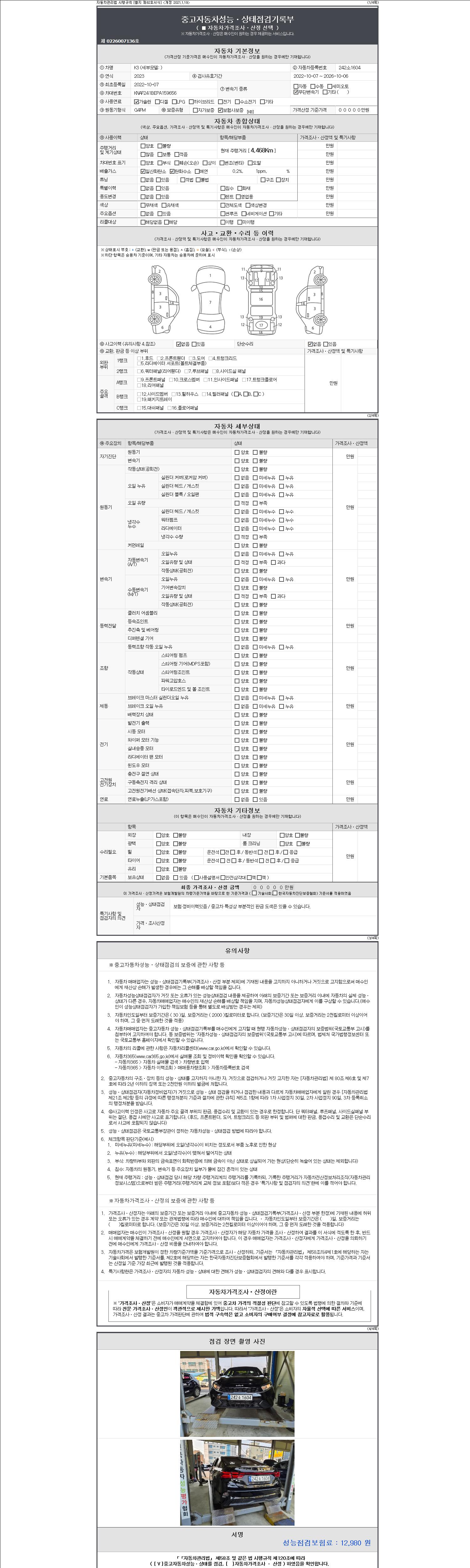 자동차관리법 시행규칙 제120조의 규정에 따라 별지 제 82호서식 《중고자동차 성능, 상태점검 기록부》를 발행한 성능, 상태점검자 및 매매자는 아래의 보증기간 또는 보증거리 이내의 중고자동차, 성능점검 기록부에 기재된 내용과 자동차의 실제 성능, 상태가 다른 경우 계약 또는 관계법령에 따라 매수인에 대하여 책임을 집니다.