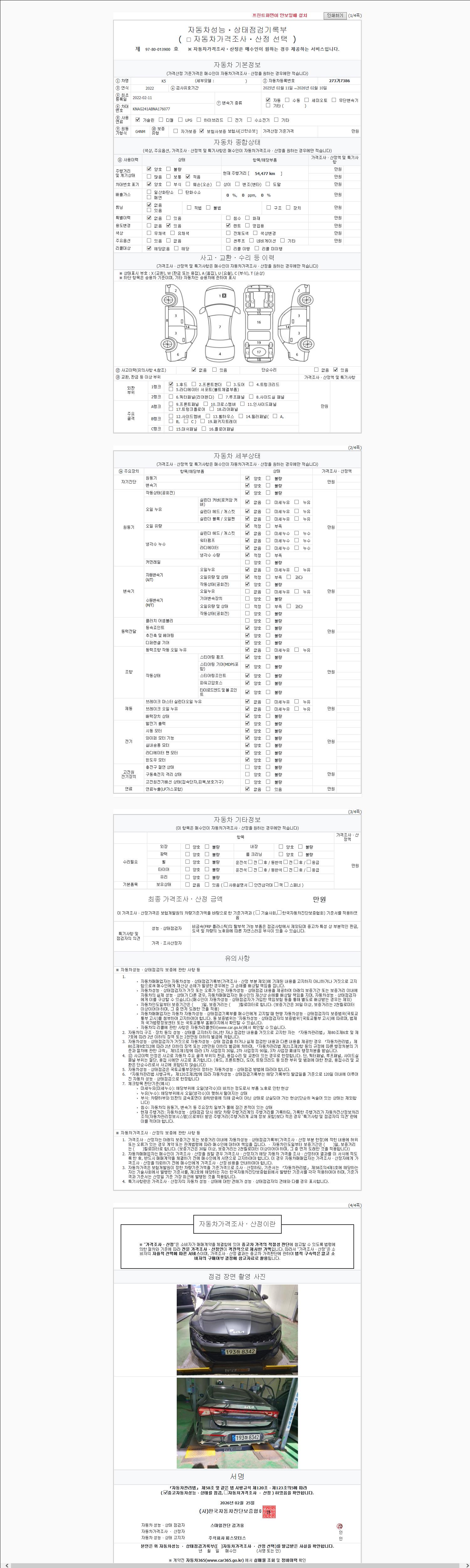 | 주행거리 | 54,477 km | 차량번호 | 273거7386 | 사고유무 | 성능기록부 참조 | 제시번호 | 제 2026008686 호 |