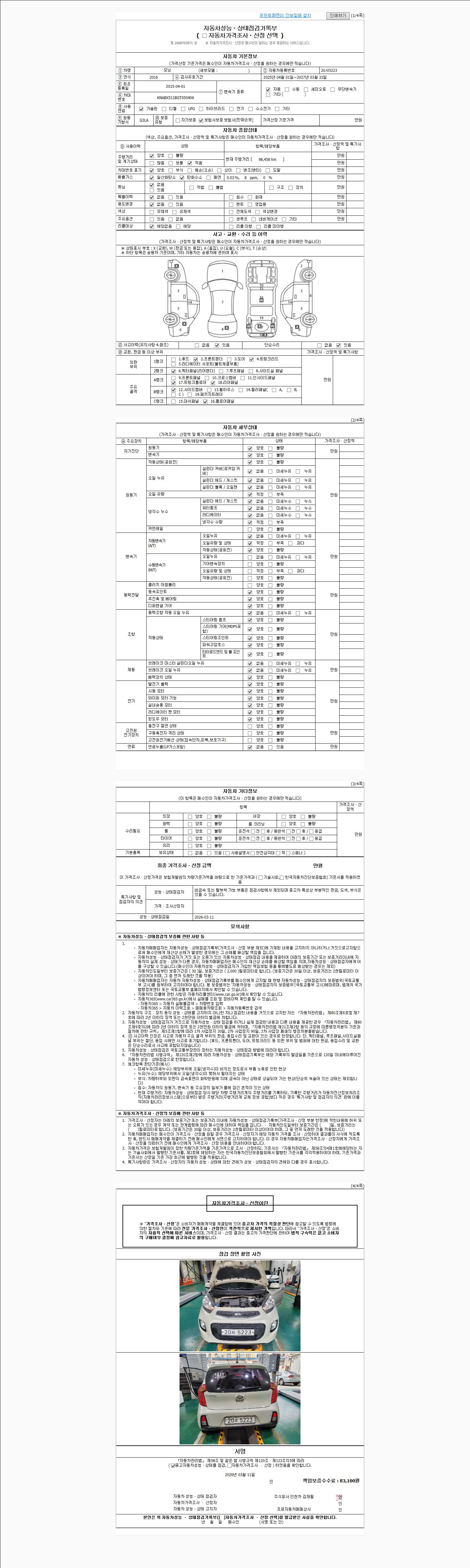 | 주행거리 | 98,458 km | 차량번호 | 20서5223 | 사고유무 | 성능기록부 참조 | 제시번호 | 제 2026012679 호 |