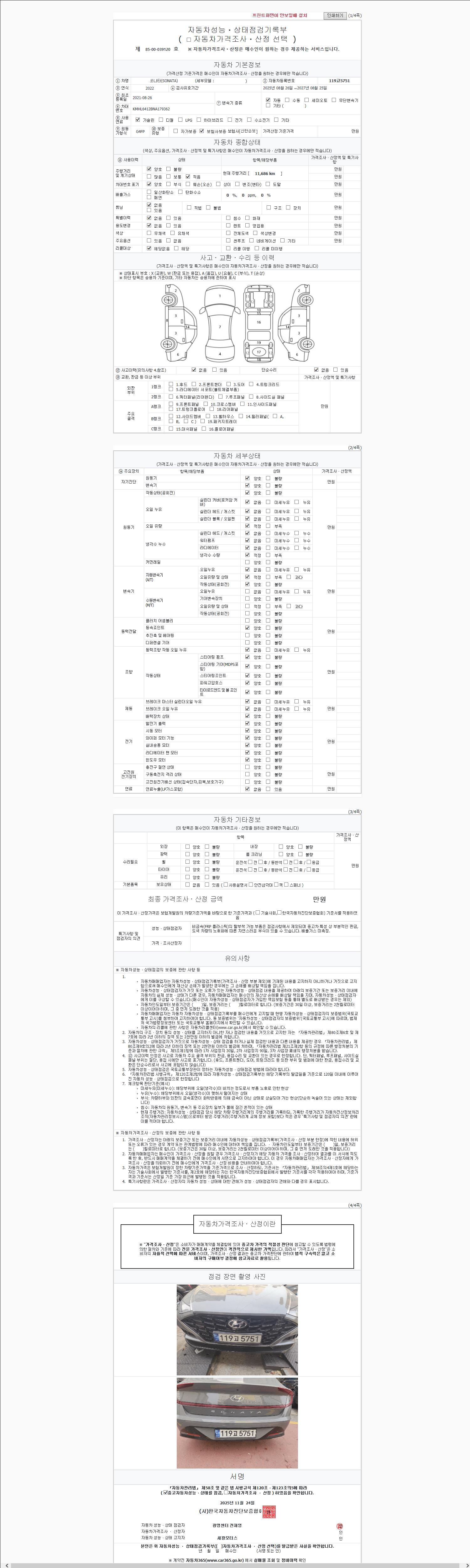 자동차관리법 시행규칙 제120조의 규정에 따라 별지 제 82호서식 《중고자동차 성능, 상태점검 기록부》를 발행한 성능, 상태점검자 및 매매자는 아래의 보증기간 또는 보증거리 이내의 중고자동차, 성능점검 기록부에 기재된 내용과 자동차의 실제 성능, 상태가 다른 경우 계약 또는 관계법령에 따라 매수인에 대하여 책임을 집니다.