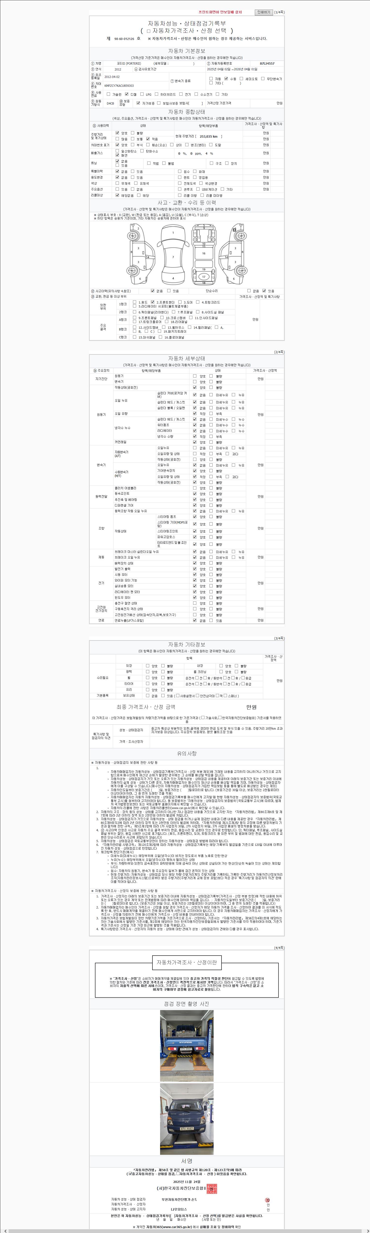 | 주행거리 | 253,000 km | 차량번호 | 87나4557 | 사고유무 | 성능기록부 참조 | 제시번호 | 제 2025216394 호 |