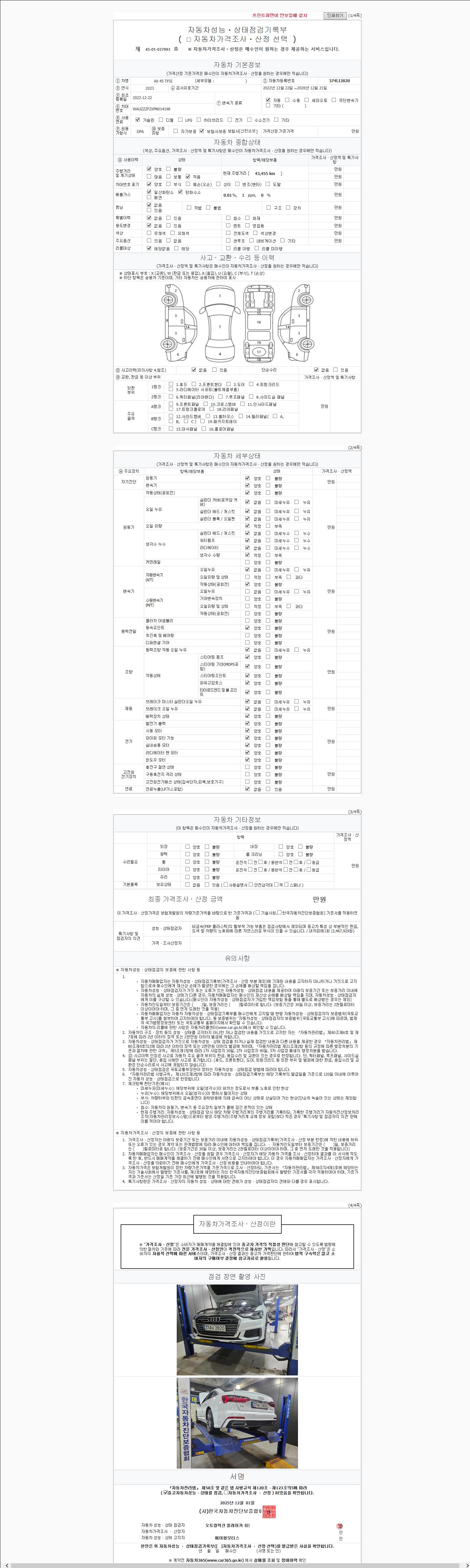 | 주행거리 | 43,455 km | 차량번호 | 374나2820 | 사고유무 | 성능기록부 참조 | 제시번호 | 제 2147483647 호 |