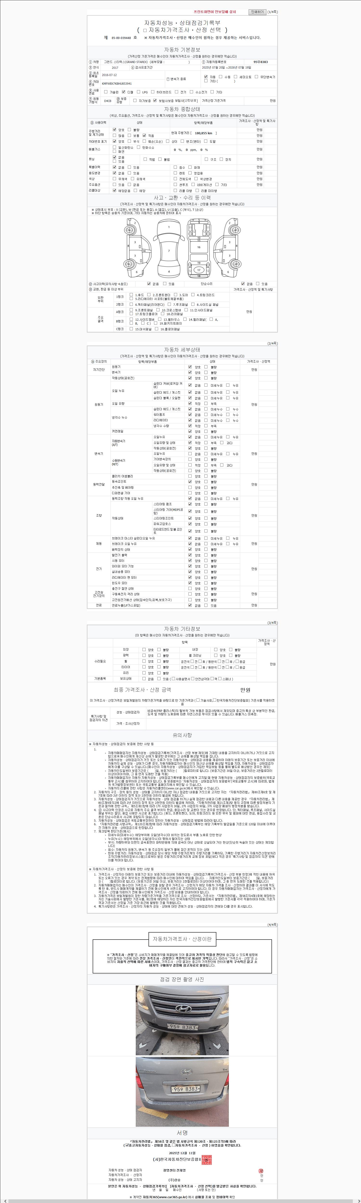 | 주행거리 | 180,855 km | 차량번호 | 95우8383 | 사고유무 | 성능기록부 참조 | 제시번호 | 제 2147483647 호 |