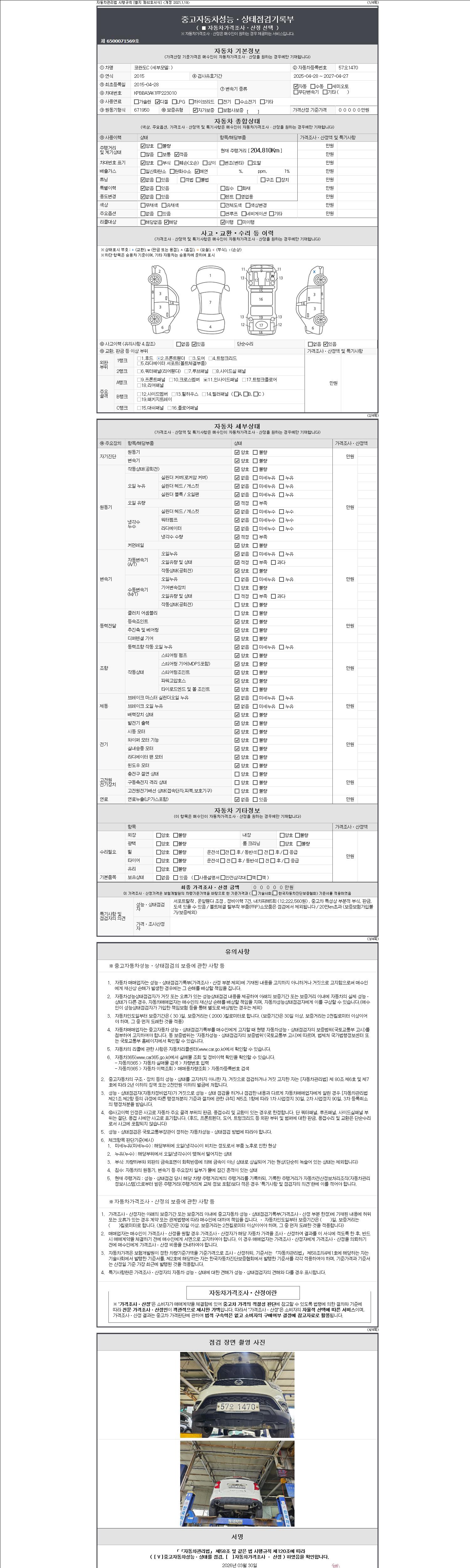 -중고자동차 매매업자를 통해 차량을 구입하실 경우 반드시 "중고자동차 성능, 상태점검 기록부"를 교뷰 받으셔야 하며, 매매업자는 반드시 의무 교부 하여야 압니다.