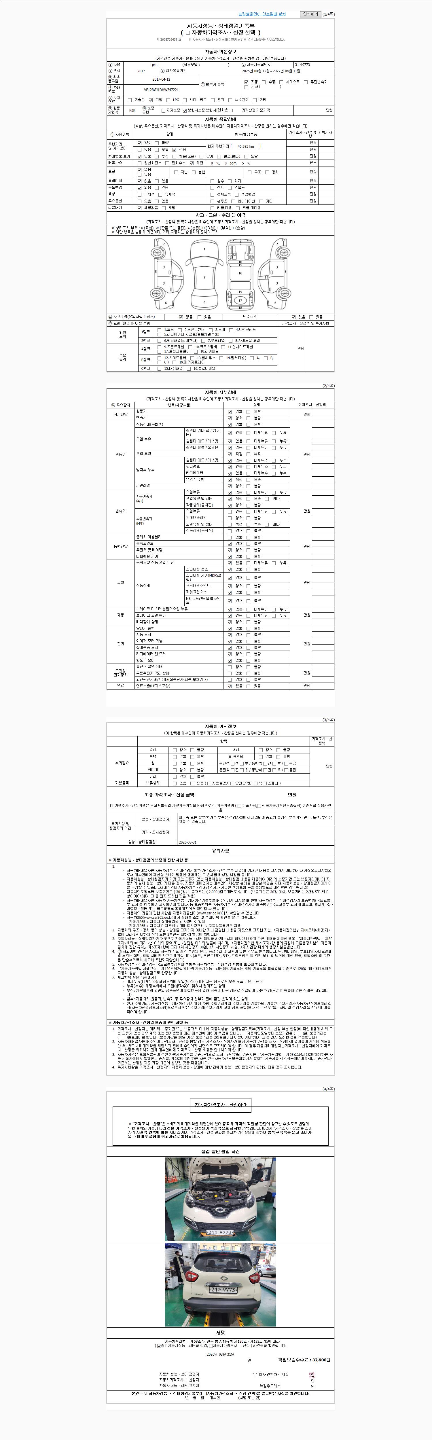 자동차관리법 시행규칙 제120조의 규정에 따라 별지 제 82호서식 《중고자동차 성능, 상태점검 기록부》를 발행한 성능, 상태점검자 및 매매자는 아래의 보증기간 또는 보증거리 이내의 중고자동차, 성능점검 기록부에 기재된 내용과 자동차의 실제 성능, 상태가 다른 경우 계약 또는 관계법령에 따라 매수인에 대하여 책임을 집니다.