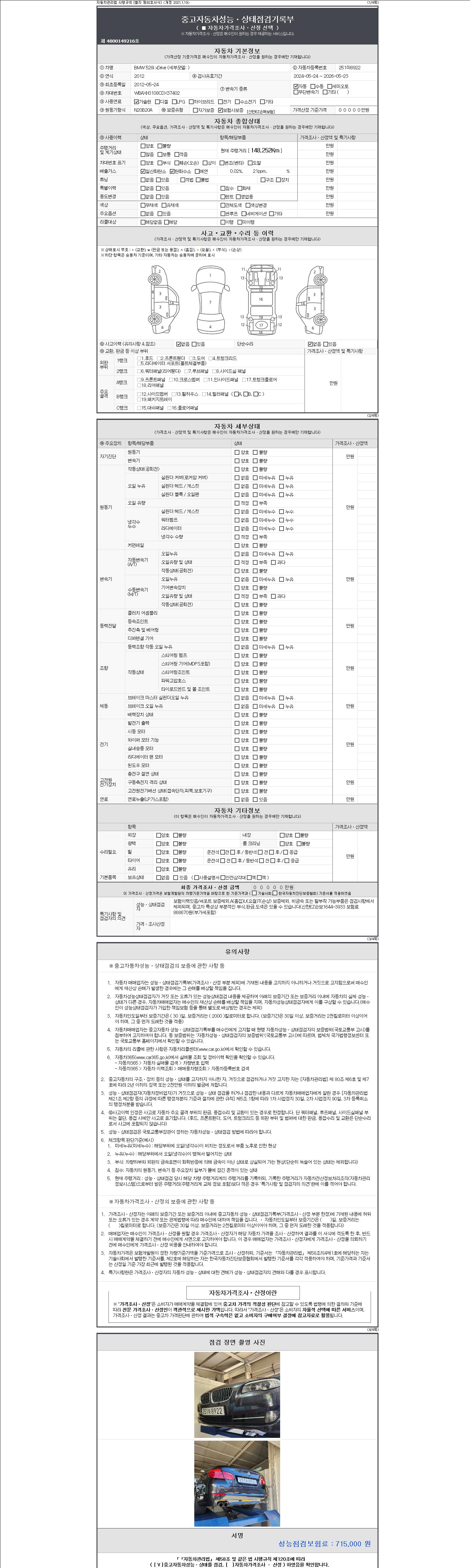 -중고자동차 매매업자를 통해 차량을 구입하실 경우 반드시 "중고자동차 성능, 상태점검 기록부"를 교뷰 받으셔야 하며, 매매업자는 반드시 의무 교부 하여야 압니다.