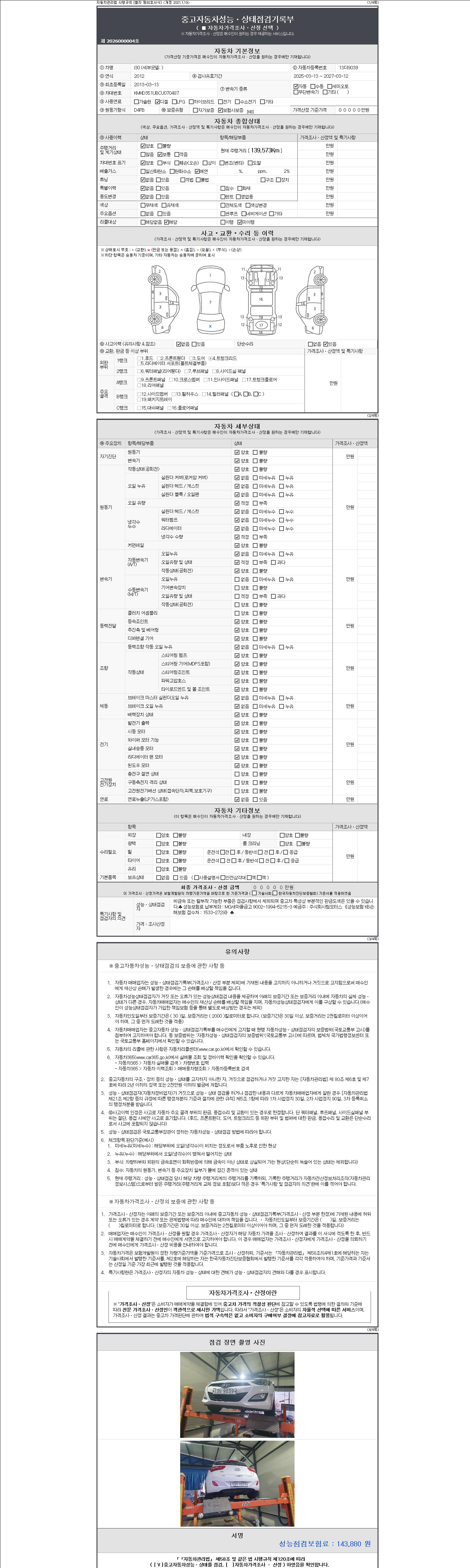 -중고자동차 매매업자를 통해 차량을 구입하실 경우 반드시 "중고자동차 성능, 상태점검 기록부"를 교뷰 받으셔야 하며, 매매업자는 반드시 의무 교부 하여야 압니다.