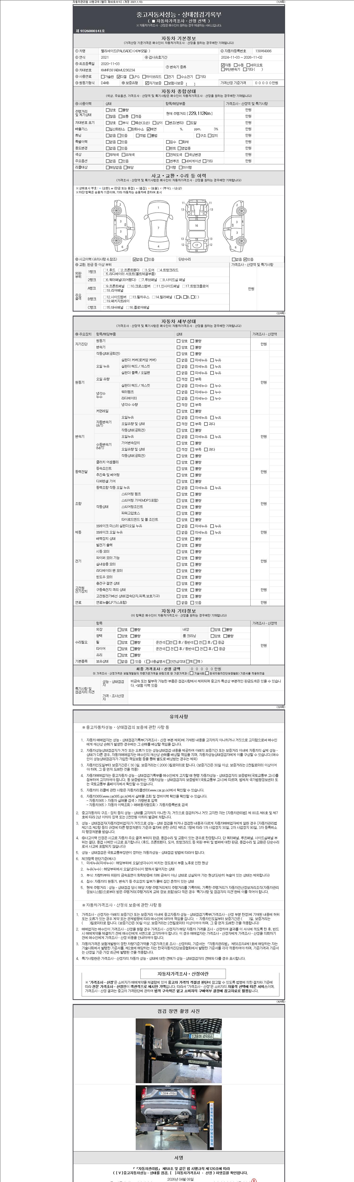 자동차관리법 시행규칙 제120조의 규정에 따라 별지 제 82호서식 《중고자동차 성능, 상태점검 기록부》를 발행한 성능, 상태점검자 및 매매자는 아래의 보증기간 또는 보증거리 이내의 중고자동차, 성능점검 기록부에 기재된 내용과 자동차의 실제 성능, 상태가 다른 경우 계약 또는 관계법령에 따라 매수인에 대하여 책임을 집니다.