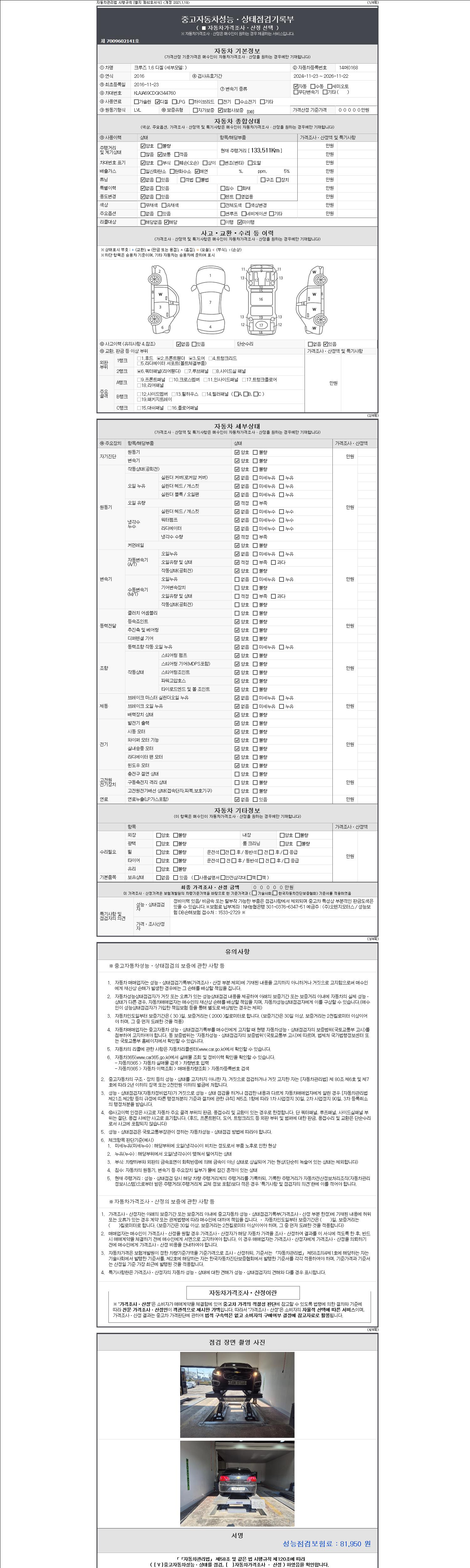 자동차관리법 시행규칙 제120조의 규정에 따라 별지 제 82호서식 《중고자동차 성능, 상태점검 기록부》를 발행한 성능, 상태점검자 및 매매자는 아래의 보증기간 또는 보증거리 이내의 중고자동차, 성능점검 기록부에 기재된 내용과 자동차의 실제 성능, 상태가 다른 경우 계약 또는 관계법령에 따라 매수인에 대하여 책임을 집니다.