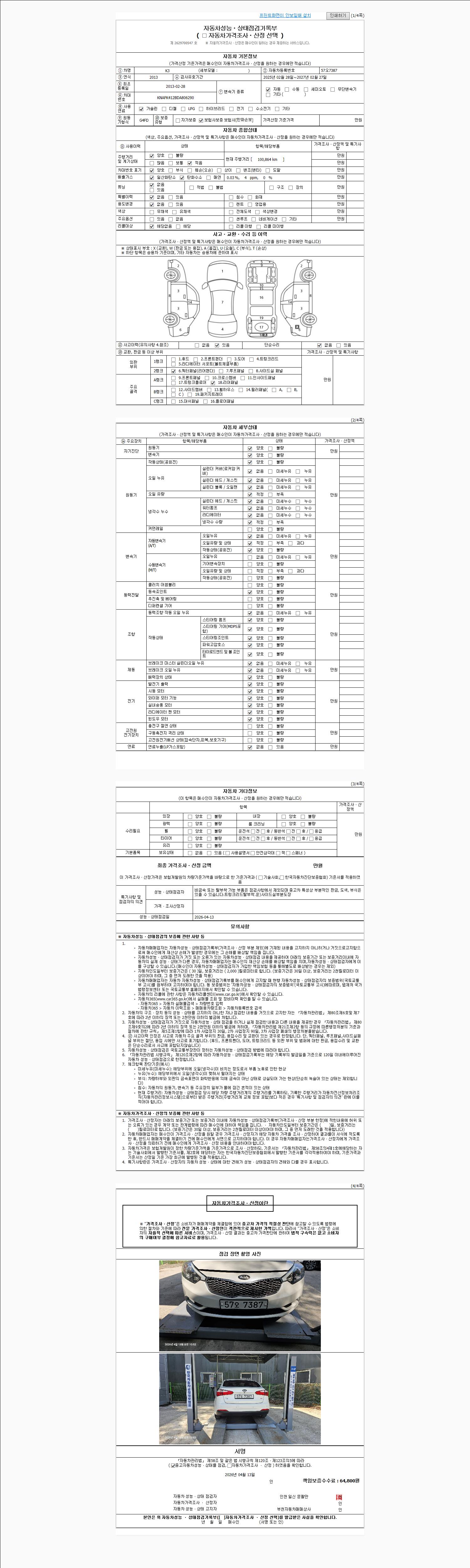 | 주행거리 | 100,864 km | 차량번호 | 57오7387 | 사고유무 | 성능기록부 참조 | 제시번호 | 제 2026019221 호 |
