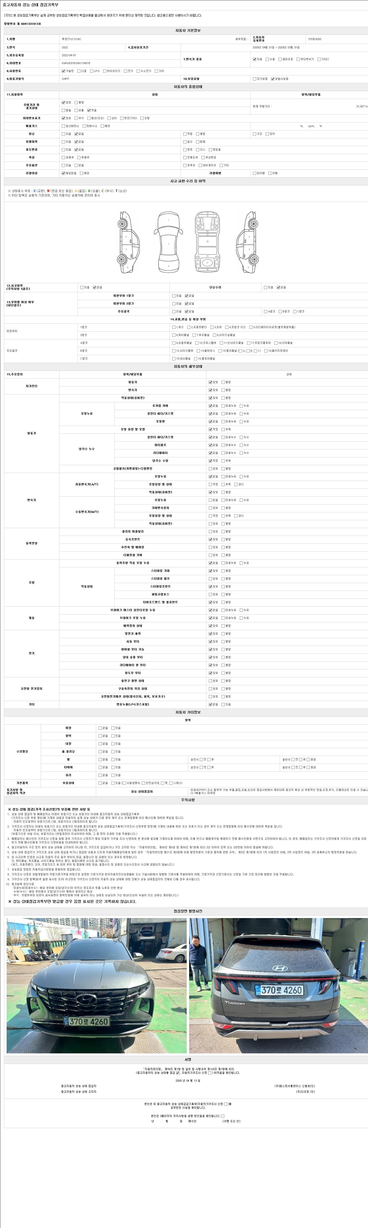 | 주행거리 | 21,927 km | 차량번호 | 370로4260 | 사고유무 | 성능기록부 참조 | 제시번호 | 제 2026011860 호 |