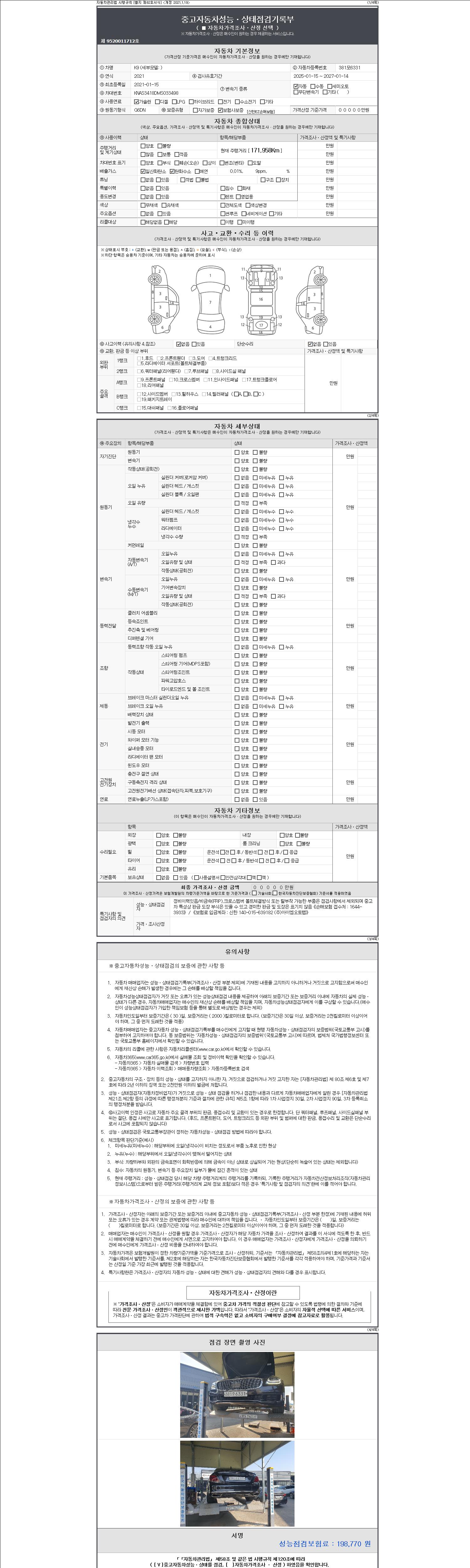 자동차관리법 시행규칙 제120조의 규정에 따라 별지 제 82호서식 《중고자동차 성능, 상태점검 기록부》를 발행한 성능, 상태점검자 및 매매자는 아래의 보증기간 또는 보증거리 이내의 중고자동차, 성능점검 기록부에 기재된 내용과 자동차의 실제 성능, 상태가 다른 경우 계약 또는 관계법령에 따라 매수인에 대하여 책임을 집니다.
