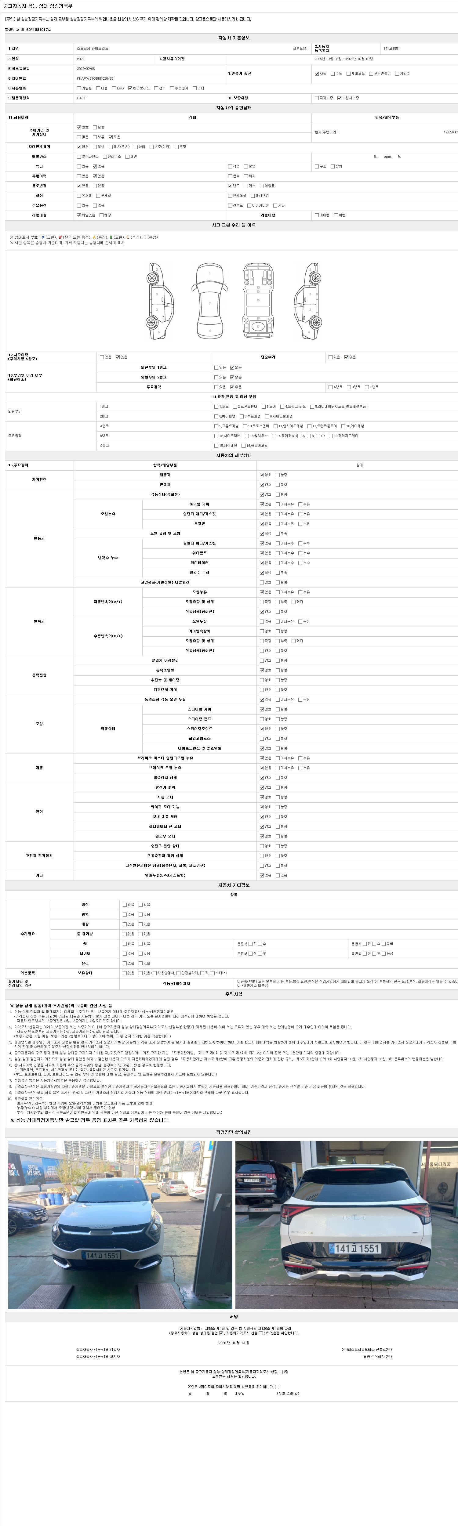 | 주행거리 | 17,856 km | 차량번호 | 141고1551 | 사고유무 | 성능기록부 참조 | 제시번호 | 제 2026011980 호 |
