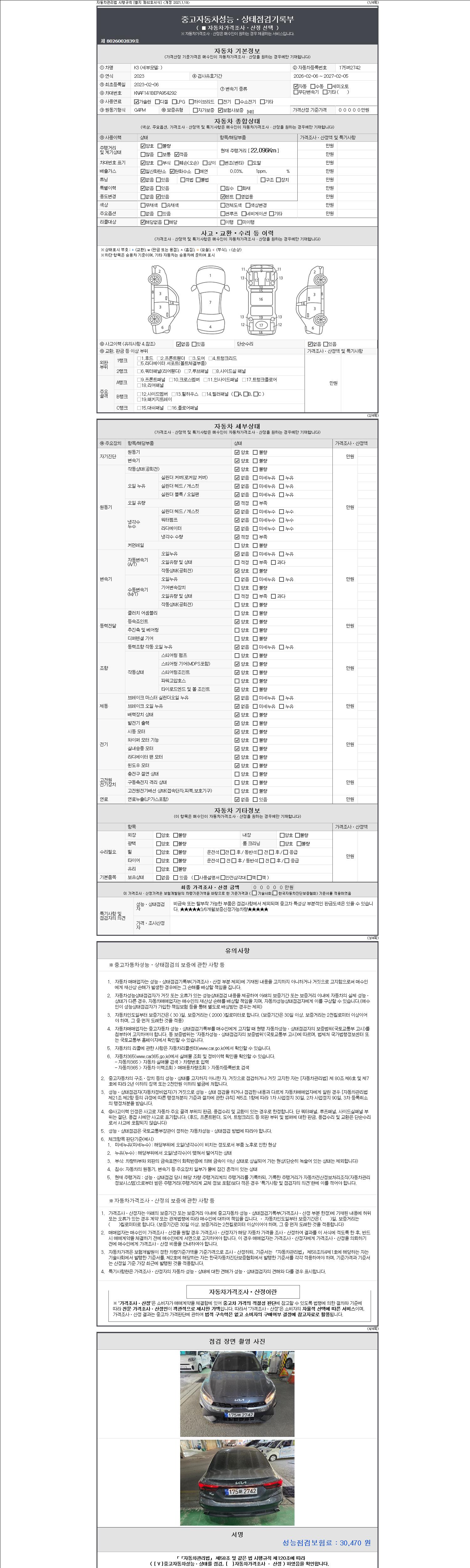 -중고자동차 매매업자를 통해 차량을 구입하실 경우 반드시 "중고자동차 성능, 상태점검 기록부"를 교뷰 받으셔야 하며, 매매업자는 반드시 의무 교부 하여야 압니다.