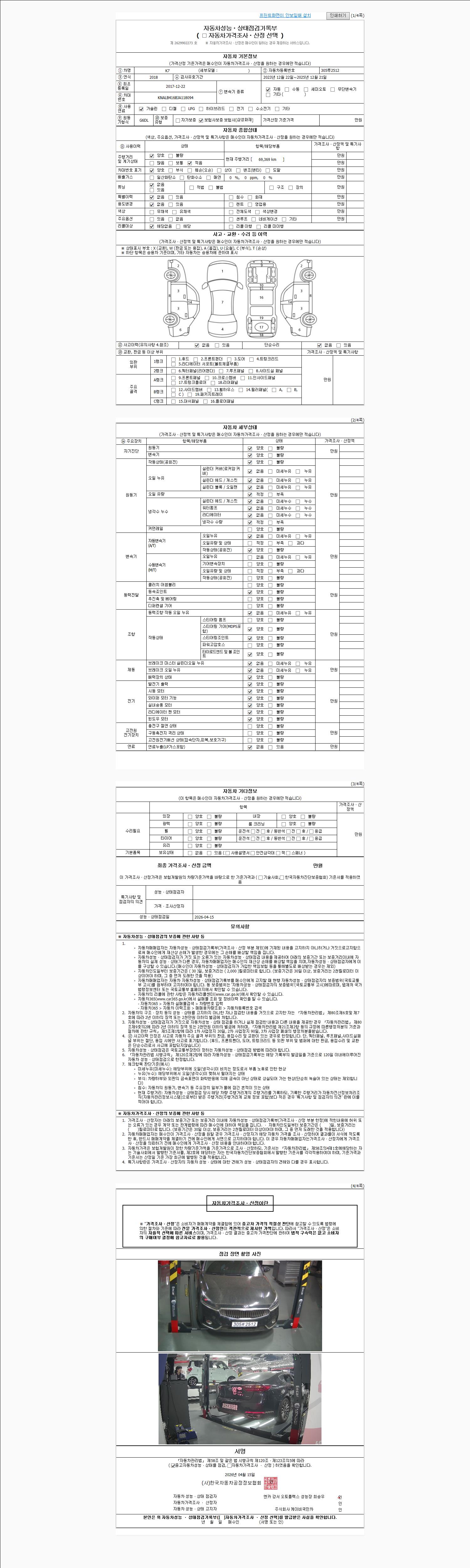 | 주행거리 | 69,369 km | 차량번호 | 305루2512 | 사고유무 | 성능기록부 참조 | 제시번호 | 제 2026047928 호 |