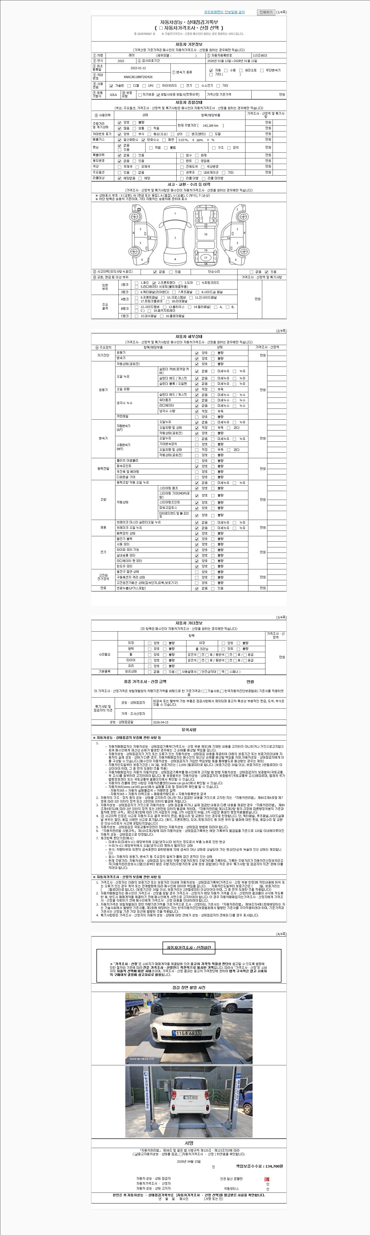 | 주행거리 | 143,189 km | 차량번호 | 115조6833 | 사고유무 | 성능기록부 참조 | 제시번호 | 제 2026019791 호 |