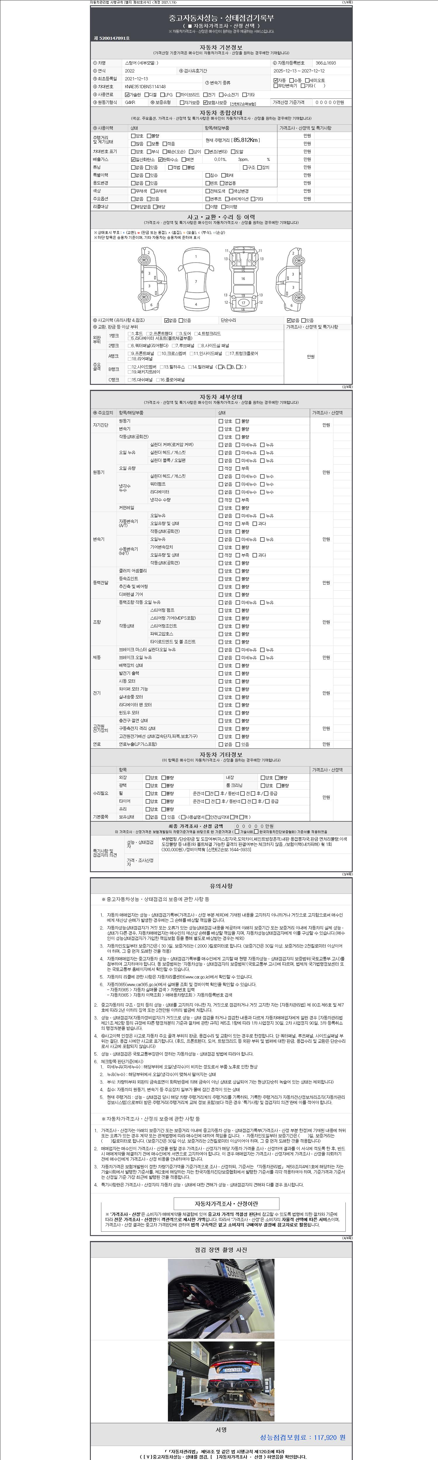 자동차관리법 시행규칙 제120조의 규정에 따라 별지 제 82호서식 《중고자동차 성능, 상태점검 기록부》를 발행한 성능, 상태점검자 및 매매자는 아래의 보증기간 또는 보증거리 이내의 중고자동차, 성능점검 기록부에 기재된 내용과 자동차의 실제 성능, 상태가 다른 경우 계약 또는 관계법령에 따라 매수인에 대하여 책임을 집니다.