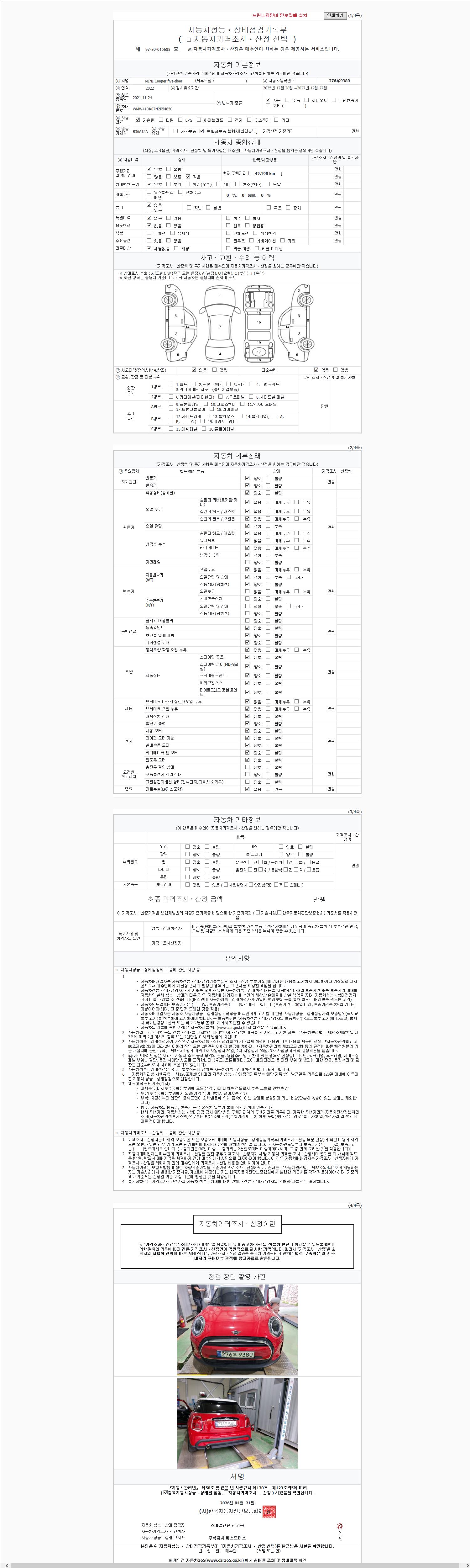 | 주행거리 | 42,198 km | 차량번호 | 276우9380 | 사고유무 | 성능기록부 참조 | 제시번호 | 제 2026013119 호 |