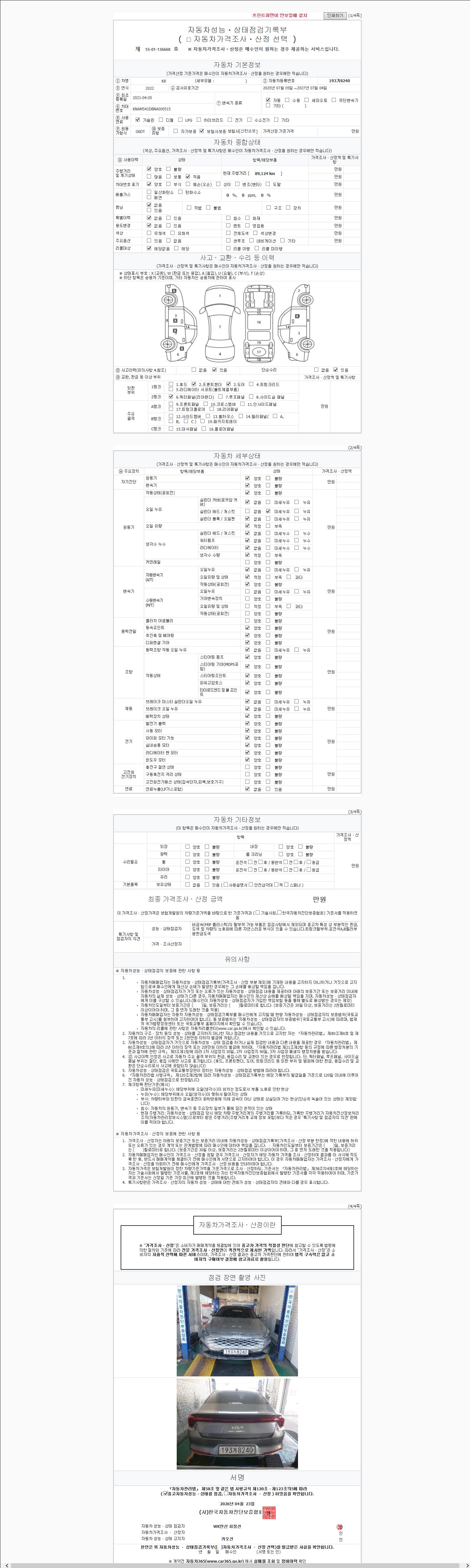| 주행거리 | 89,036 km | 차량번호 | 193거8240 | 사고유무 | 성능기록부 참조 | 제시번호 | 제 2147483647 호 |
