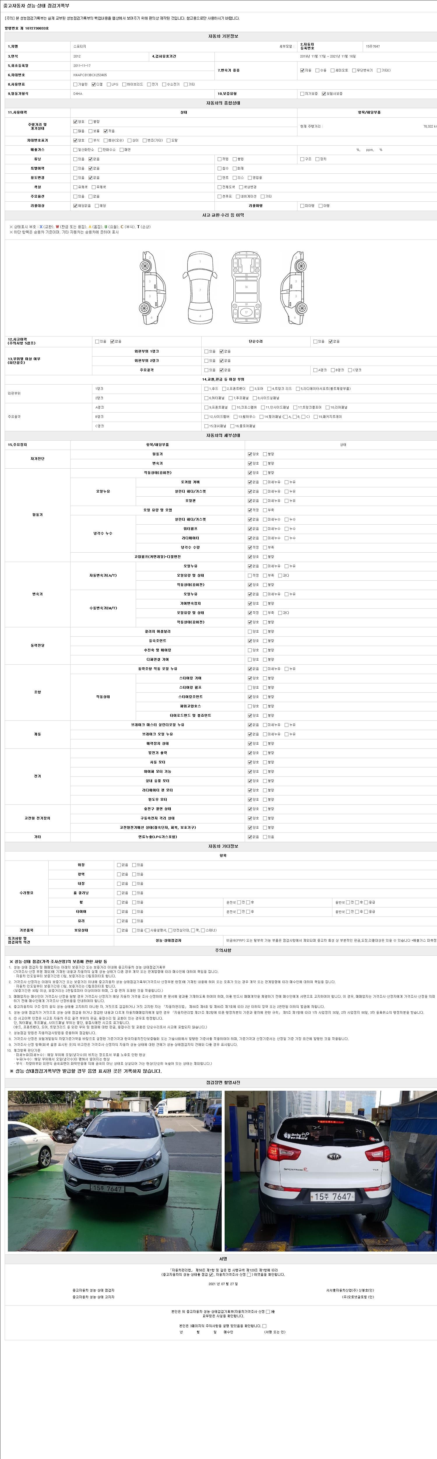 | 주행거리 | 78,322 km | 차량번호 | 15주7647 | 사고유무 | 성능기록부 참조 | 제시번호 | 제 2021032720 호 |