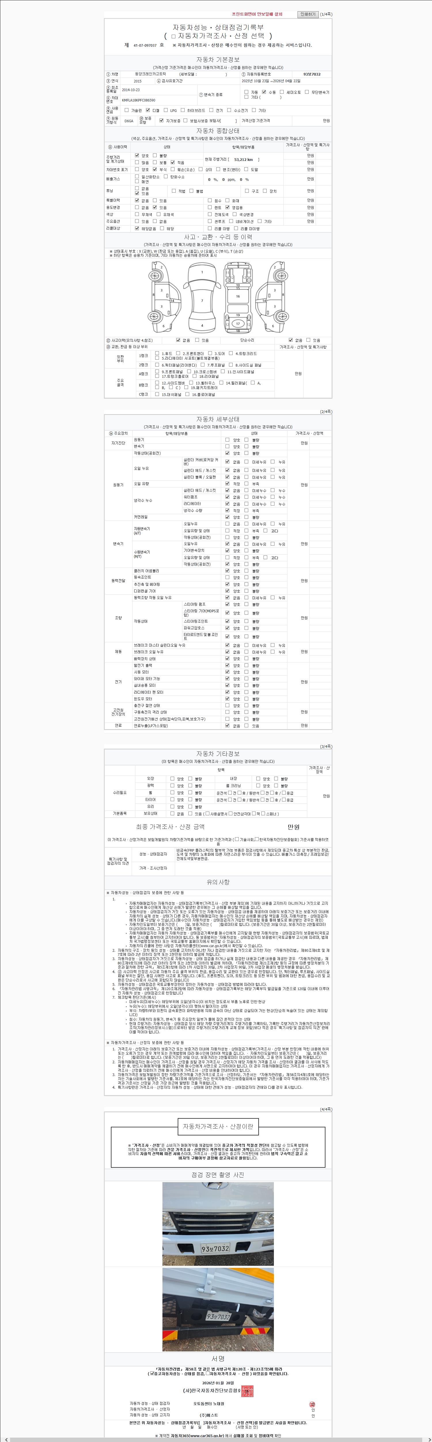 | 주행거리 | 53,075 km | 차량번호 | 93보7032 | 사고유무 | 성능기록부 참조 | 제시번호 | 제 2147483647 호 |