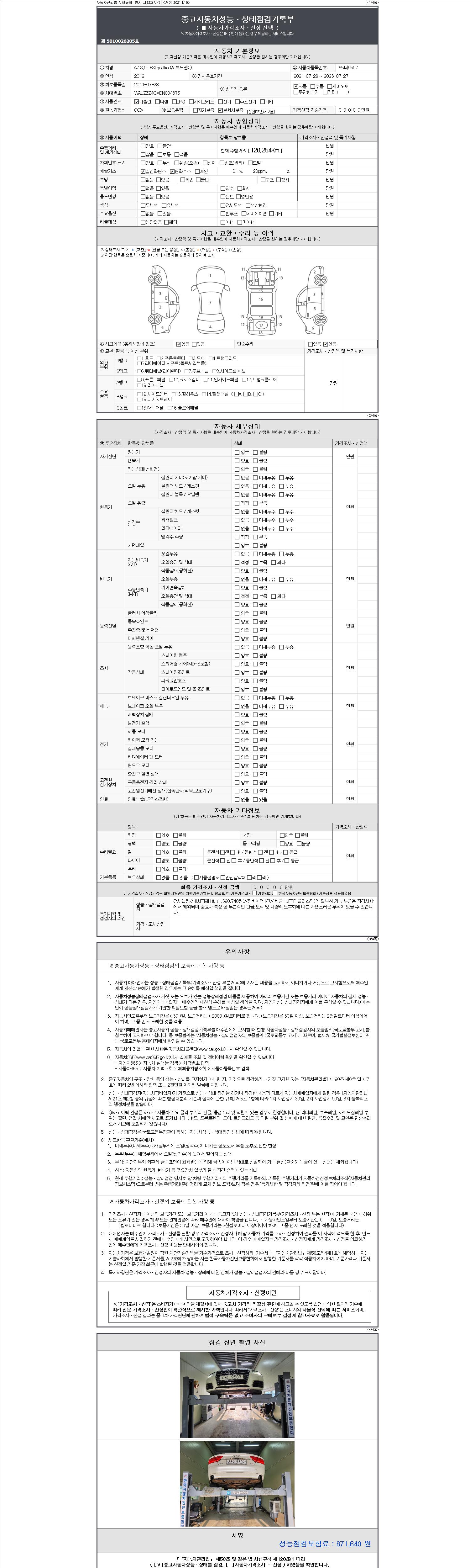 -중고자동차 매매업자를 통해 차량을 구입하실 경우 반드시 "중고자동차 성능, 상태점검 기록부"를 교뷰 받으셔야 하며, 매매업자는 반드시 의무 교부 하여야 압니다.
