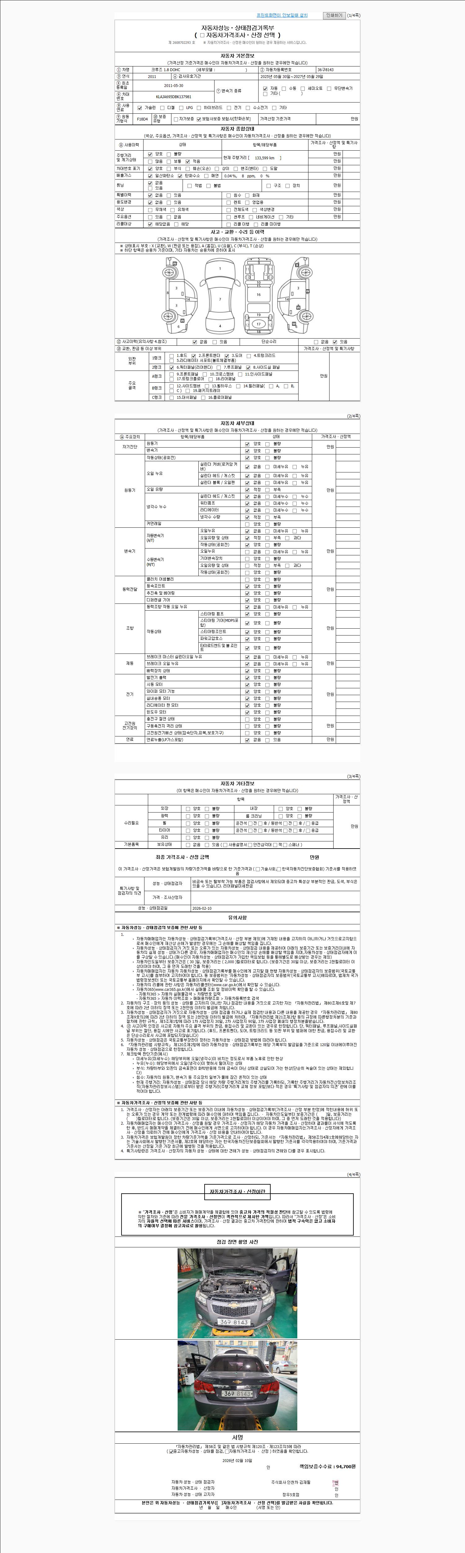 | 주행거리 | 133,541 km | 차량번호 | 36구8143 | 사고유무 | 성능기록부 참조 | 제시번호 | 제 2026007473 호 |