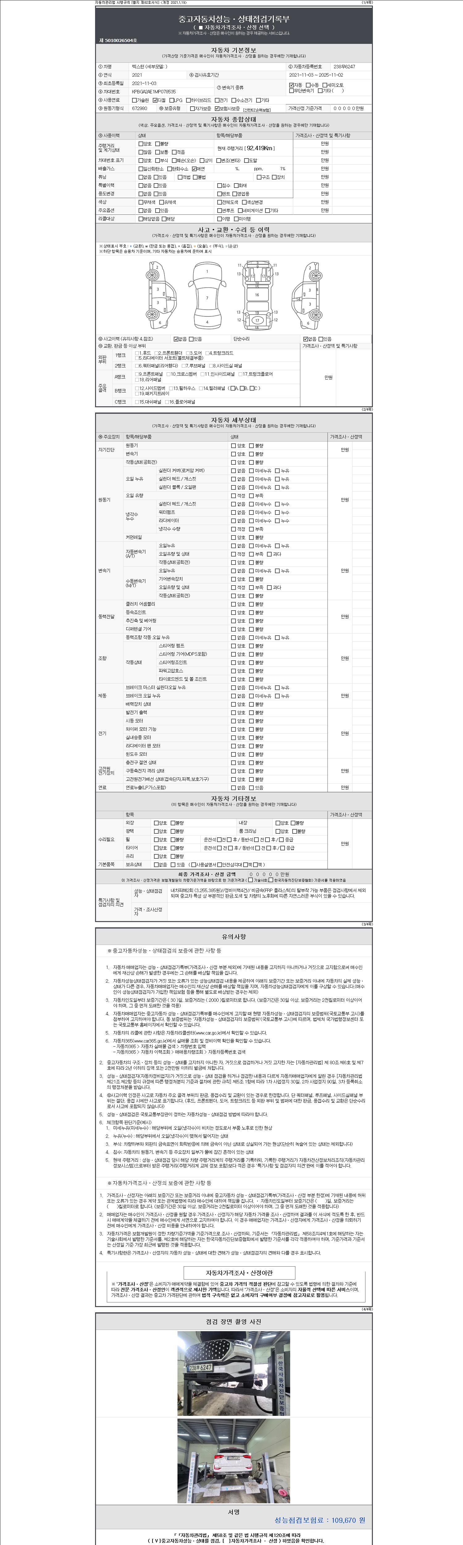 | 주행거리 | 92,419 km | 차량번호 | 238무6247 | 사고유무 | 성능기록부 참조 | 제시번호 | 제 2147483647 호 |