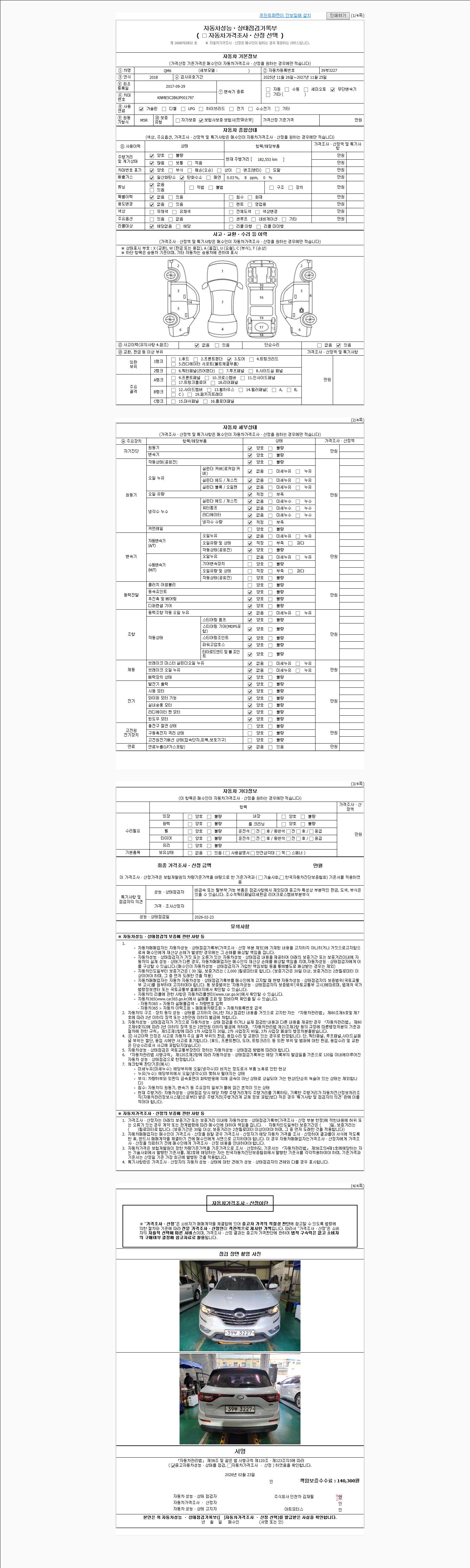 자동차관리법 시행규칙 제120조의 규정에 따라 별지 제 82호서식 《중고자동차 성능, 상태점검 기록부》를 발행한 성능, 상태점검자 및 매매자는 아래의 보증기간 또는 보증거리 이내의 중고자동차, 성능점검 기록부에 기재된 내용과 자동차의 실제 성능, 상태가 다른 경우 계약 또는 관계법령에 따라 매수인에 대하여 책임을 집니다.