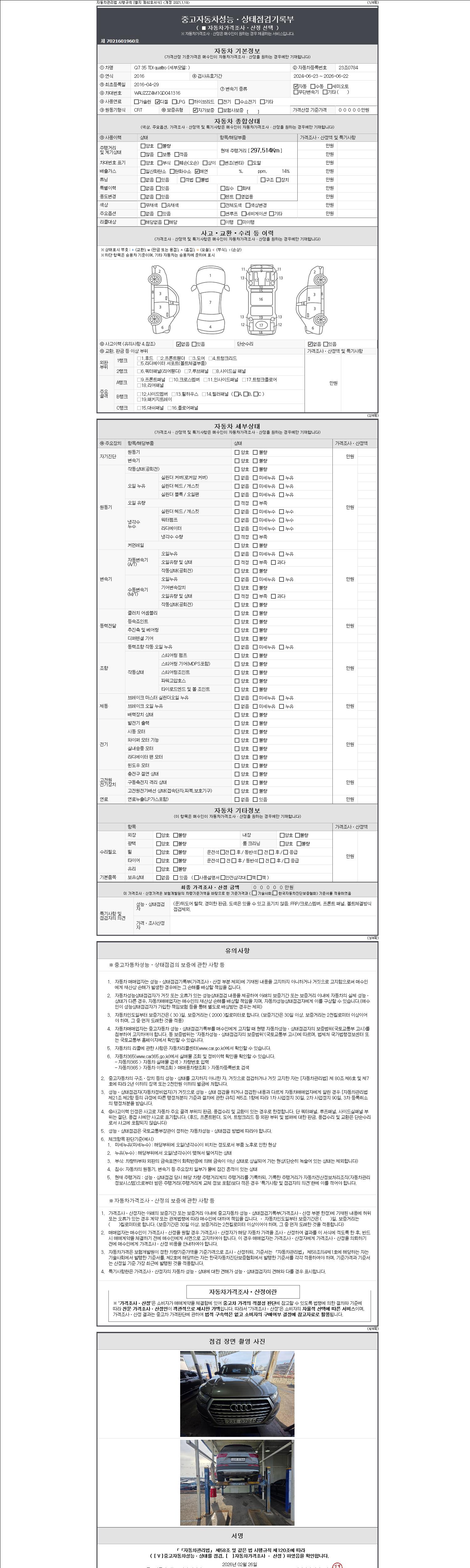 - 2. 차량 등록증이나 성능점검지 등을 상담자에게 요청및 확인하시고 사전에 미리 점검 하시기를 권유드립니다.