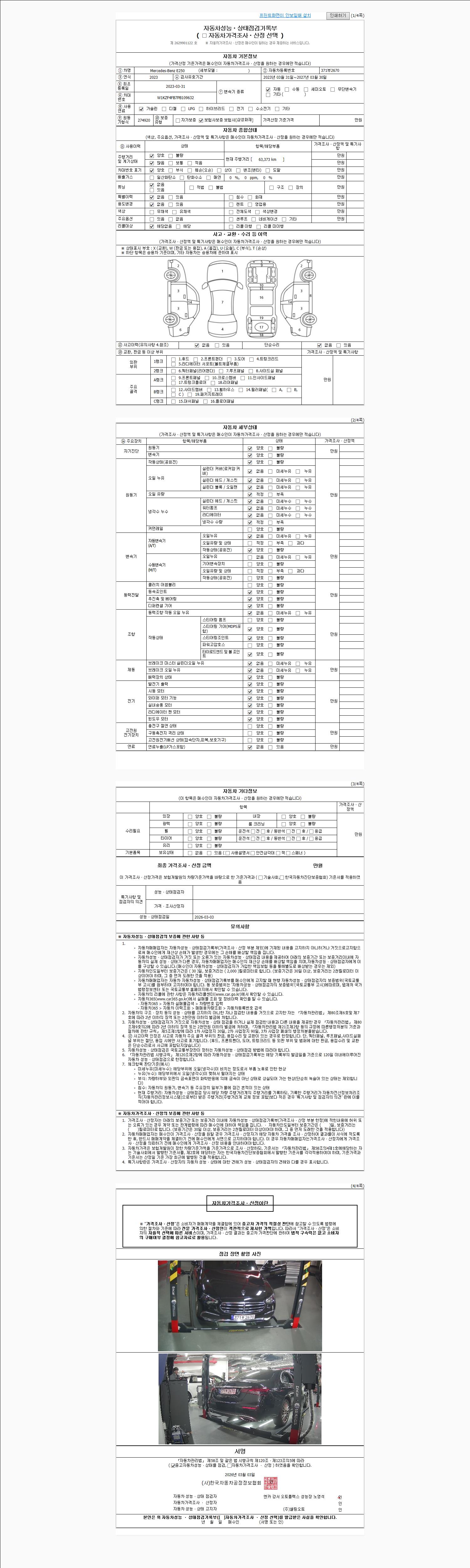 | 주행거리 | 63,373 km | 차량번호 | 371부2670 | 사고유무 | 성능기록부 참조 | 제시번호 | 제 2026026538 호 |